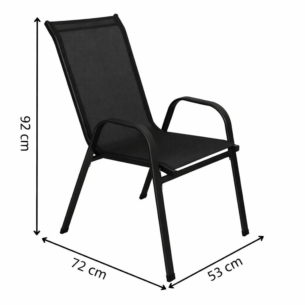 Pohodlné vonkajšie stoličky s vysokým operadlom a širokými podrúčkami zaistia komfort pri sedení. Textilný podsedák je priedušný a neabsorbuje vlhkosť, ideálny pre každé počasie. Vďaka stohovateľnosti ľahko ušetríte miesto. Kvalitné spracovanie, antikorózne lakovanie a zaoblené hrany zaručujú dlhú životnosť. Nosnosť 120 kg.