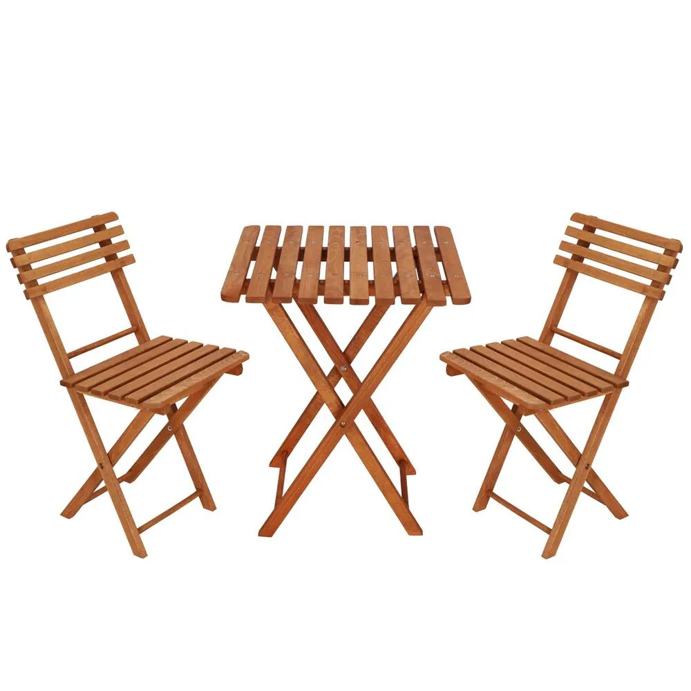 Elegantný set dreveného nábytku stôl a dve stoličky, ideálny pre menšie priestory a balkóny. Vyrobené z pevného bukového dreva s ochrannou svetlo hnedou lazúrou, ktorá zaisťuje vysokú odolnosť voči poveternostným vplyvom. Vďaka praktickému skladaciemu prevedeniu sa ľahko prenáša a uskladňuje. Vhodné na vonkajšie použitie. Nosnosť stoličky 125 kg, stôl 30 kg.