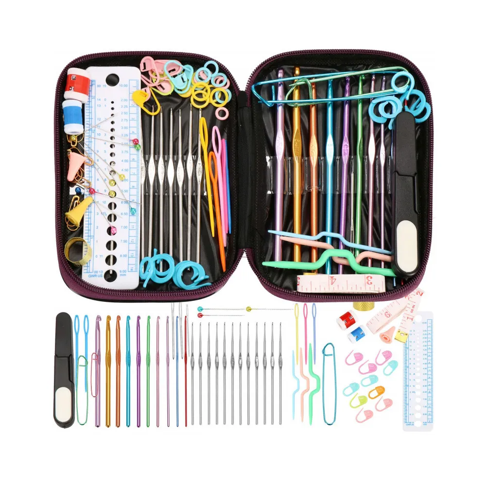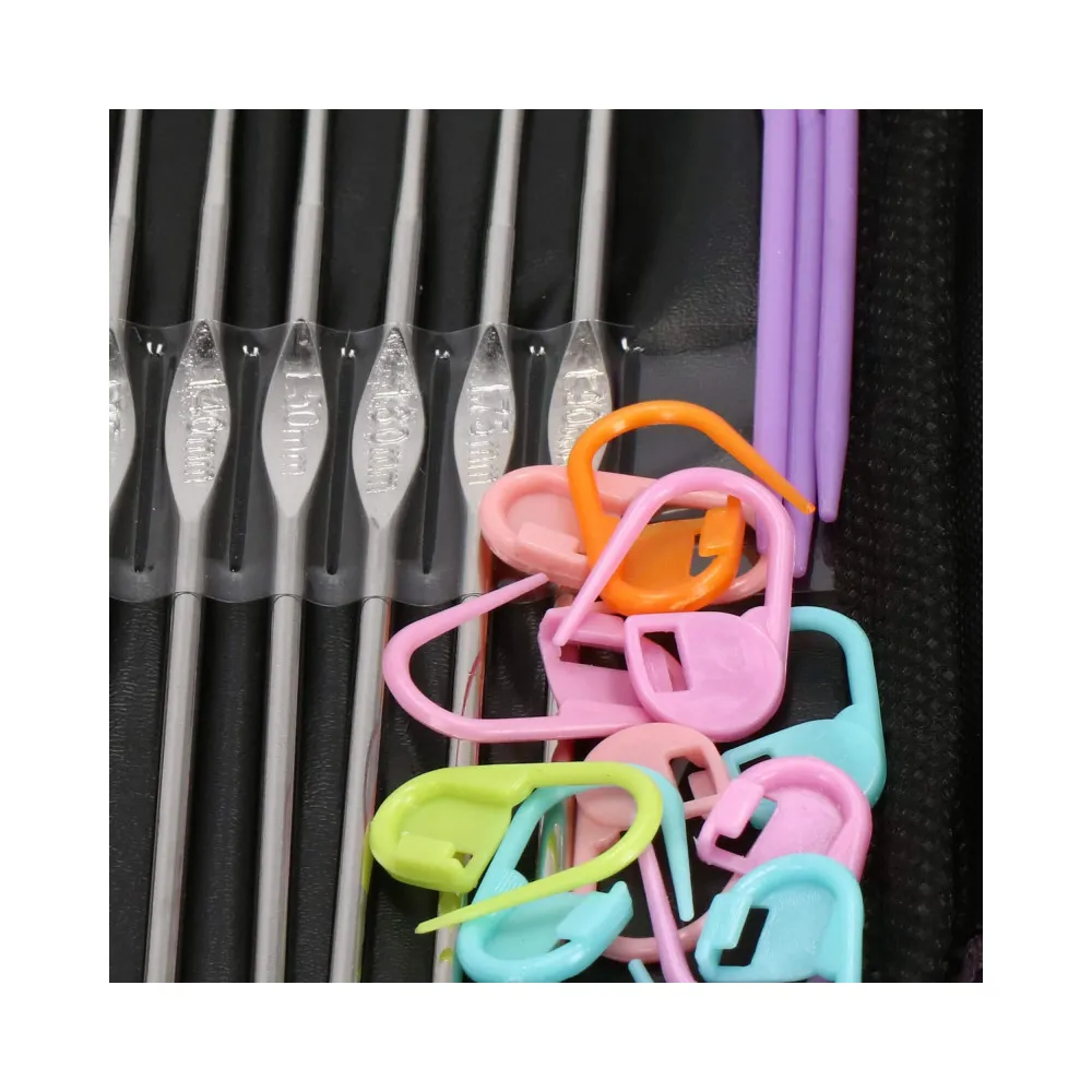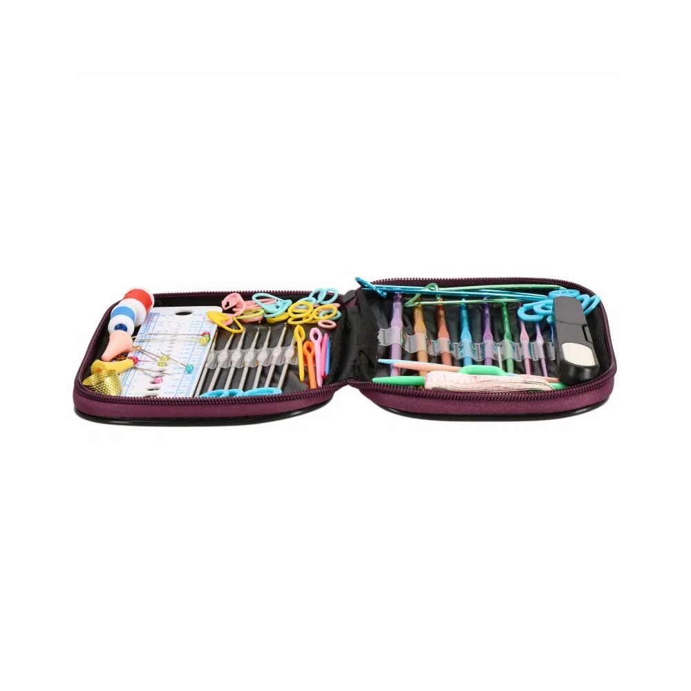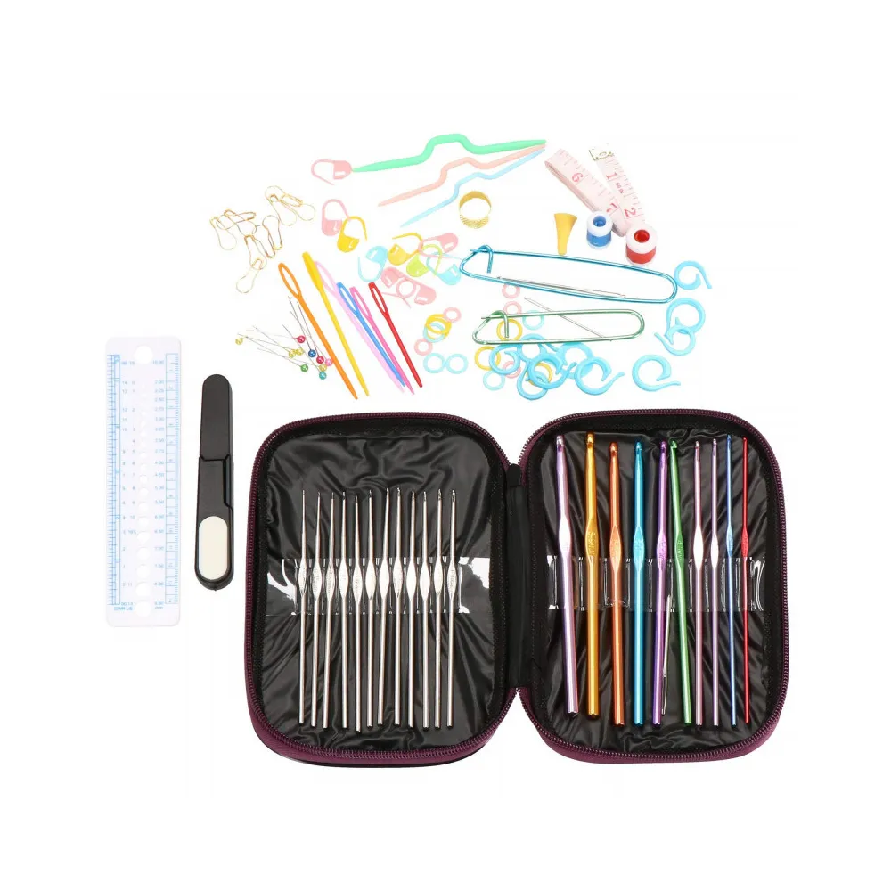 Háčkovaná sada v pevnom puzdre, ktorá obsahuje celkom 100 prvkov. Široká škála veľkostí a farieb, starostlivo vybraný materiál. Kvalitné spracovanie. Všetko potrebné v jednej sade. Ideálne na cesty.