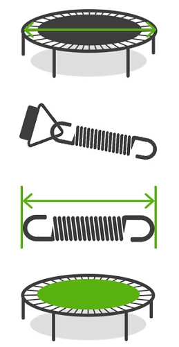 3. Priemer samotnej skákacej plochy by mal s toleranciou niekoľkých centimentov tiež súhlasiť. Dôvodom rôznej veľkosti je použitie odlišnej dĺžky pružín u konkrétnych výrobcov trampolín. Priemer samotnej skákacej plochy uvádzame bez ôk na uchytenie pružín.