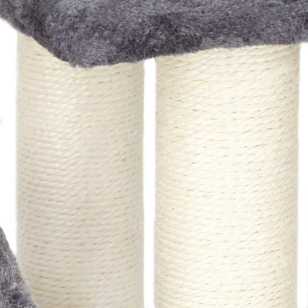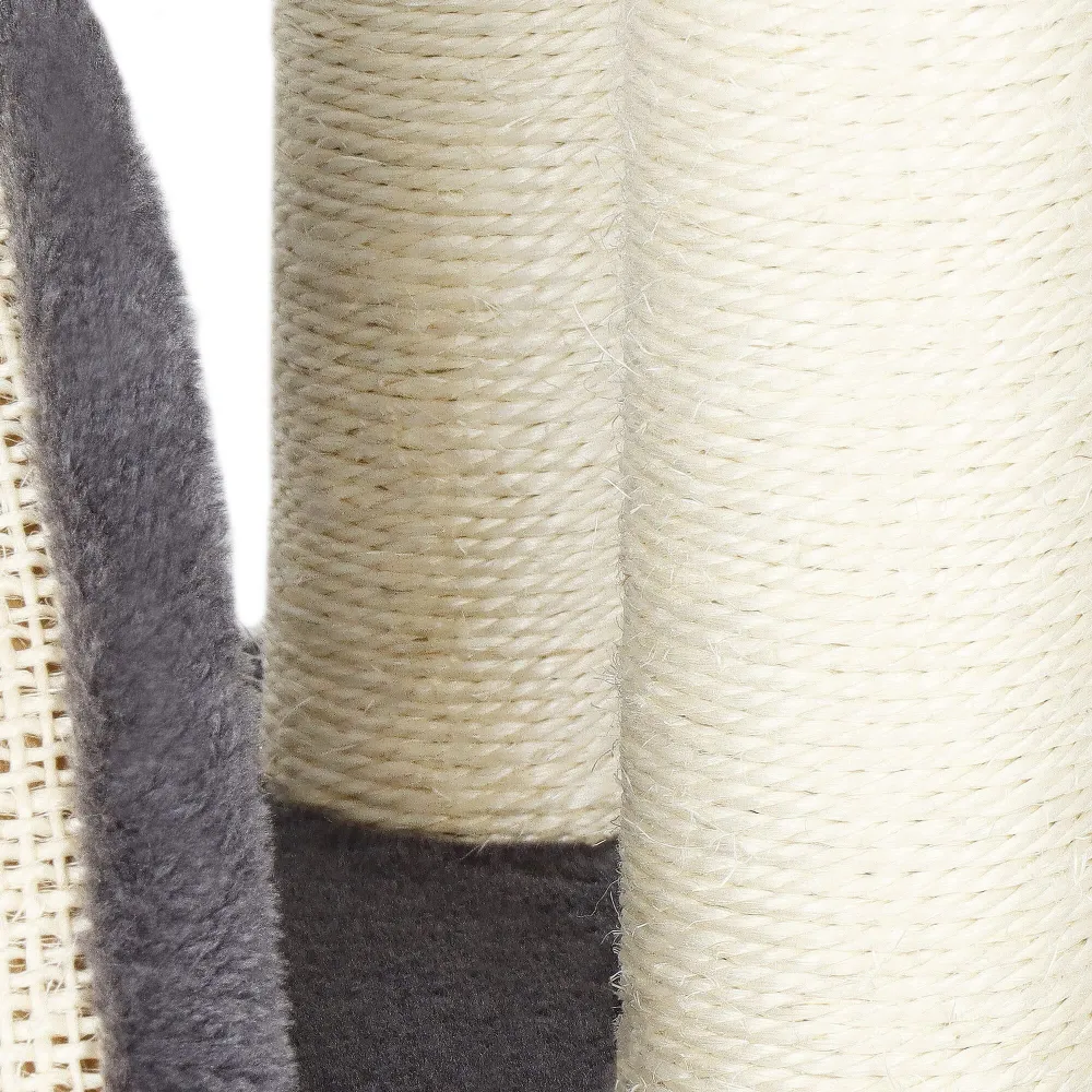 Viacúrovňové mačacie škrabadlo s tromi poschodiami, mäkkým poťahom a stabilnou konštrukciou. Obsahuje sisalové plochy na škrabanie, hračku na elastickom povrázku, tunel a odpočívadlo so zvýšeným zadkom. Ideálne na šplhanie, hru aj odpočinok.