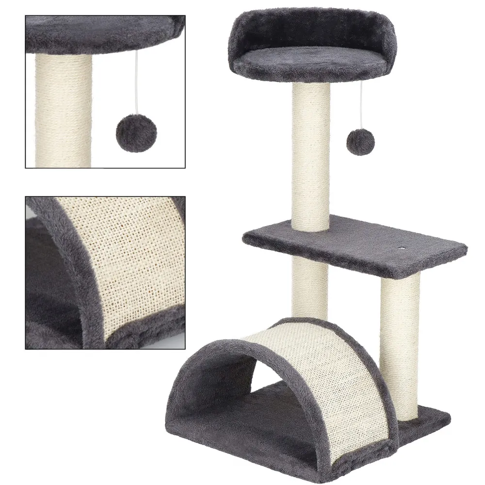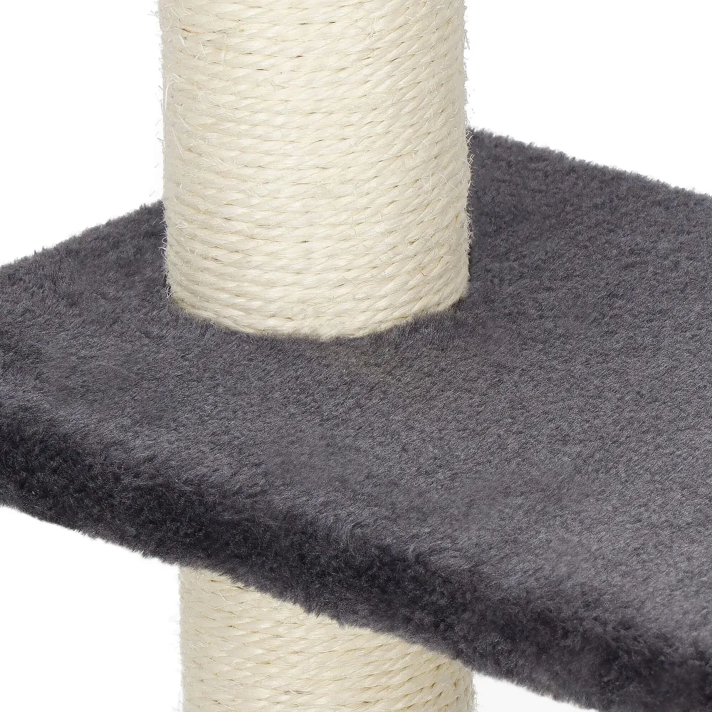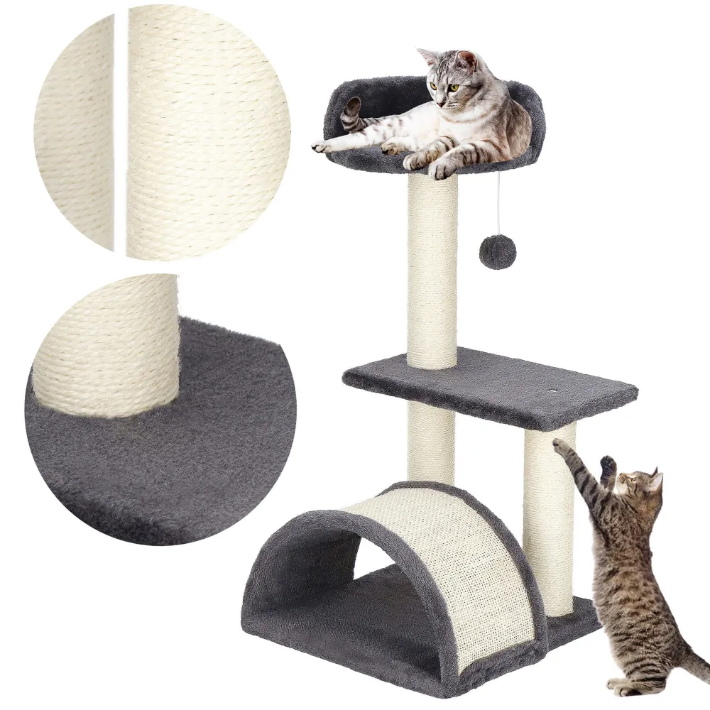 Viacúrovňové mačacie škrabadlo s tromi poschodiami, mäkkým poťahom a stabilnou konštrukciou. Obsahuje sisalové plochy na škrabanie, hračku na elastickom povrázku, tunel a odpočívadlo so zvýšeným zadkom. Ideálne na šplhanie, hru aj odpočinok.