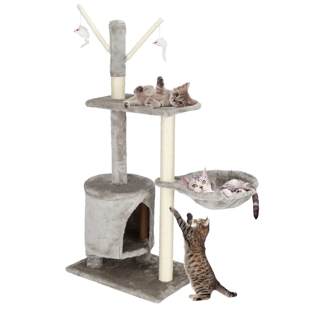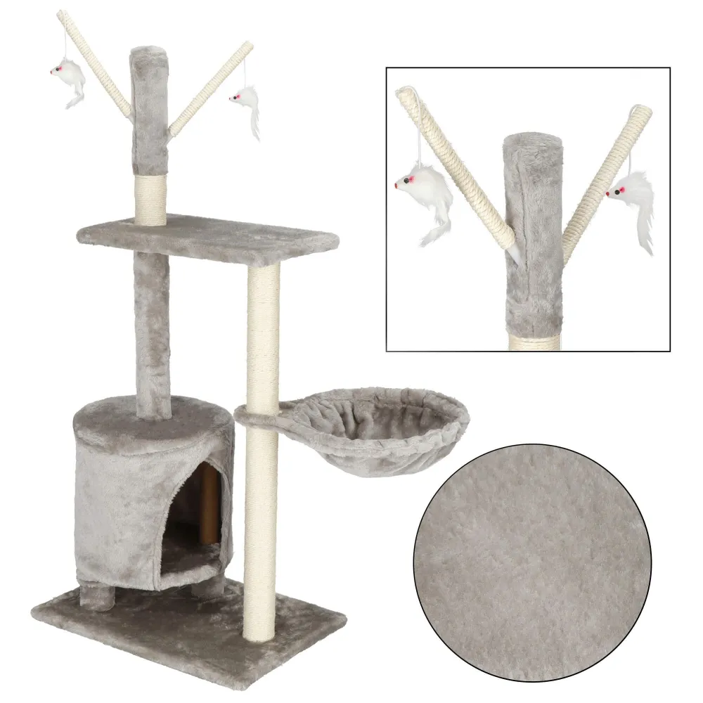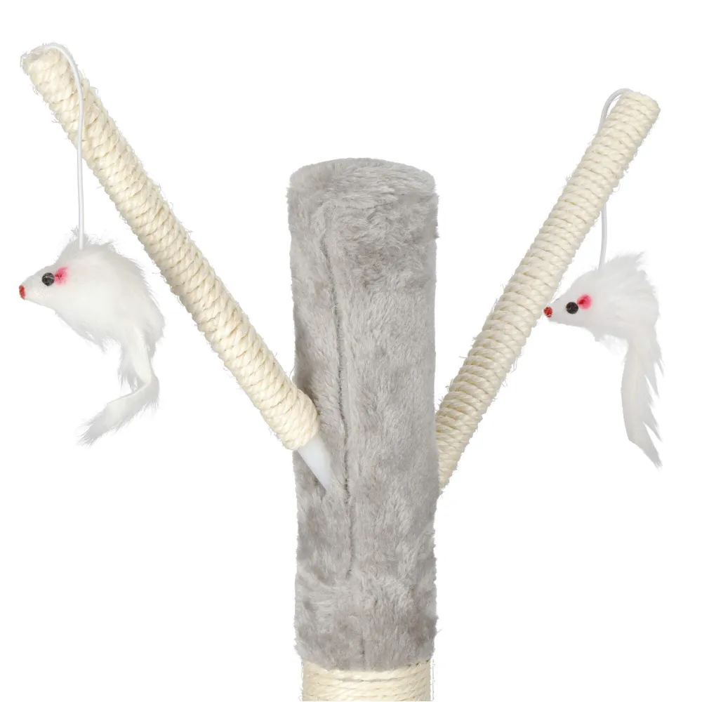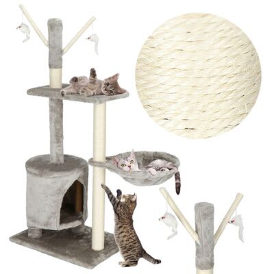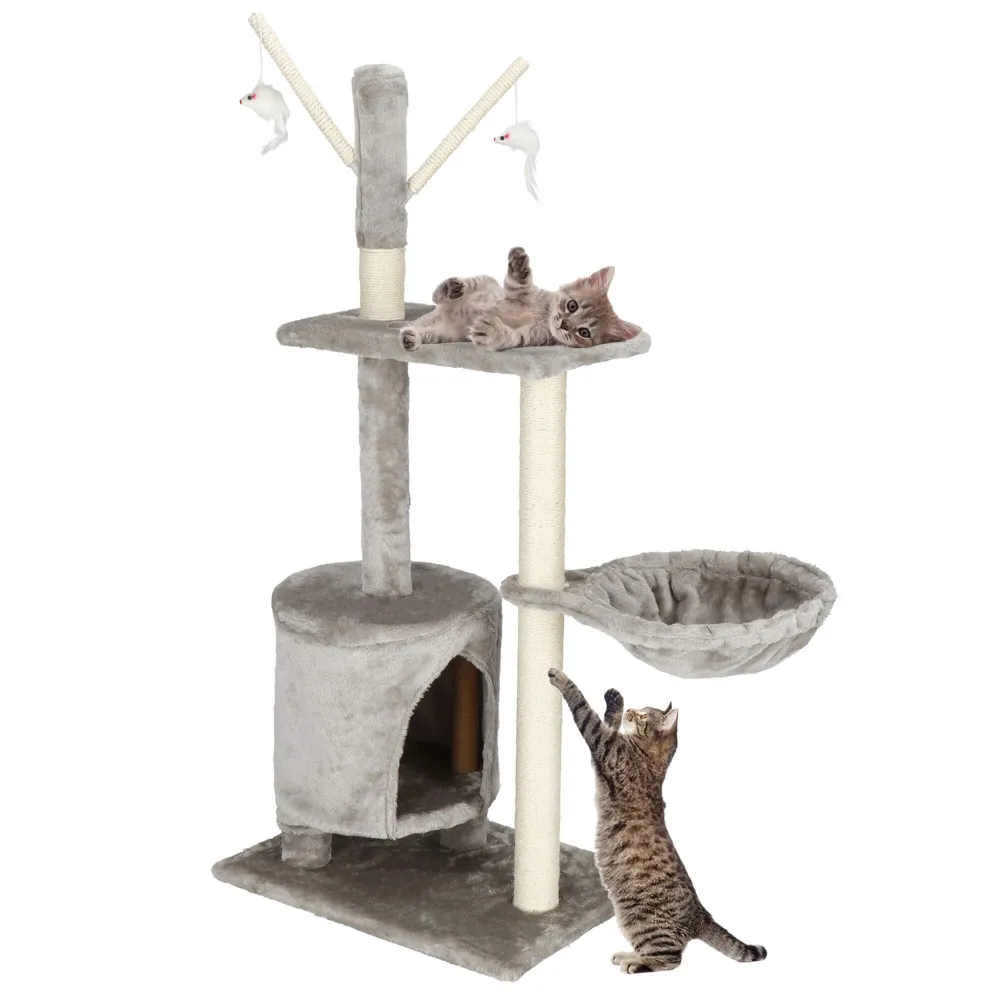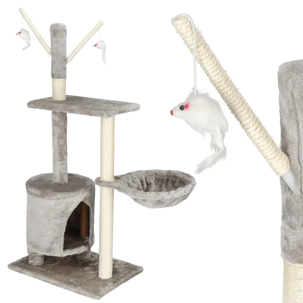 Viacúrovňové mačacie škrabadlo so štyrmi poschodiami, mäkkým poťahom a vysoko stabilnou konštrukciou. Obsahuje sisalové tyče na škrabanie, dve myšky na elastickom povrázku, útulný domček a vyvýšenú posteľ pre pohodlný odpočinok vašej mačky.