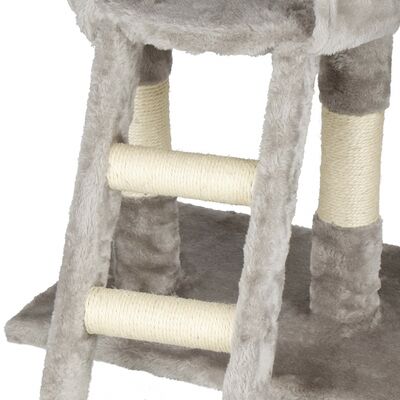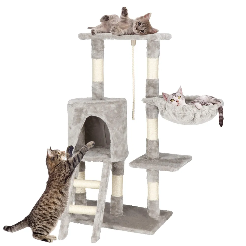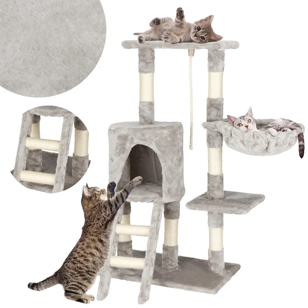 Viacúrovňové komfortne vybavené mačacie škrabadlo s piatimi poschodiami, mäkkým poťahom a stabilnou konštrukciou. Ponúka veľké množstvo sisalových plôch, pohodlné schody vedúce do útulného domčeka, vyvýšenú posteľ, odpočívadlá a závesnú hračku v podobe sisalového lana. Ideálne na šplhanie, odpočinok a hru.