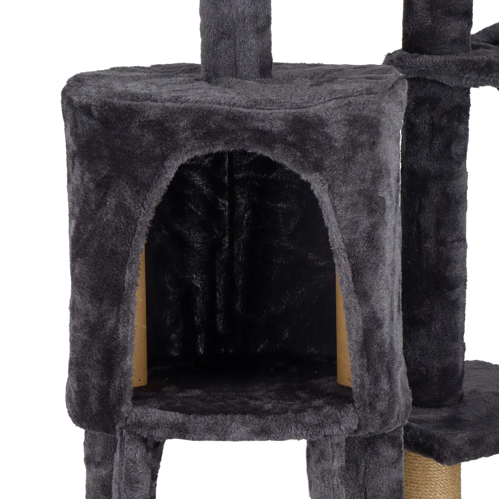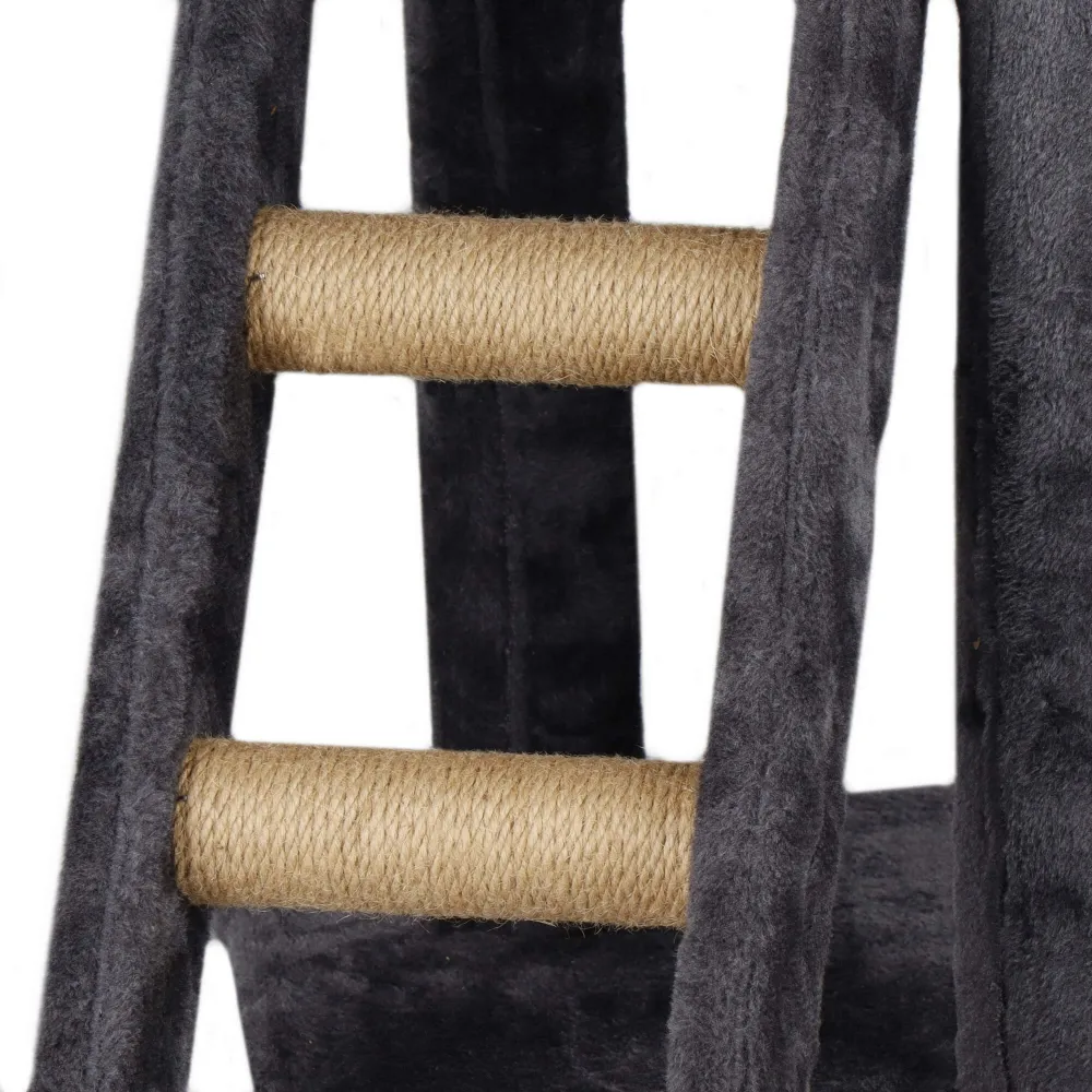 Vysoké viacúrovňové mačacie škrabadlo so šiestimi poschodiami. Ponúka stabilnú a odolnú konštrukciu, príjemný poťah, pohodlné schody vedúce do útulného domčeka, vyvýšenú posteľ, veľké množstvo sisalových plôch a dve chlpaté myšky na povrázku pre zábavu. Súčasťou sú aj odpočívadlá pre pohodlie vašej mačky.