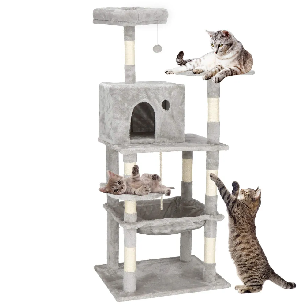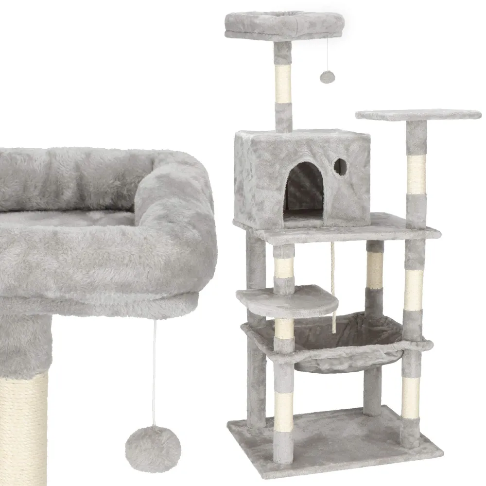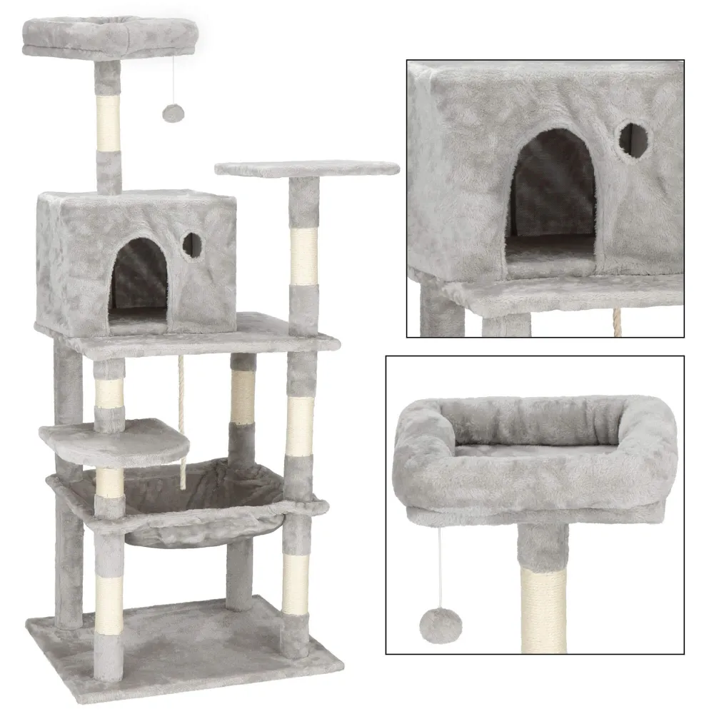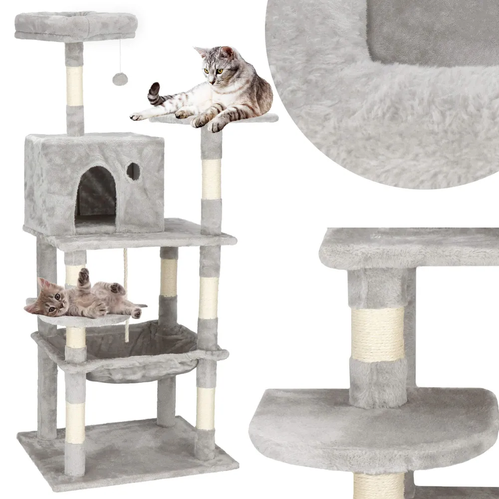 Skvele vybavené viacúrovňové mačacie škrabadlo so šiestimi poschodiami. Ponúka stabilnú a odolnú konštrukciu, sisalové tyče, príjemný zamatový poťah, útulný domček s okienkom, závesné hojdacie kreslo, kruhovú posteľ na vrchole a hračky pre zábavu. Ideálne na hranie, šplhanie a odpočinok.