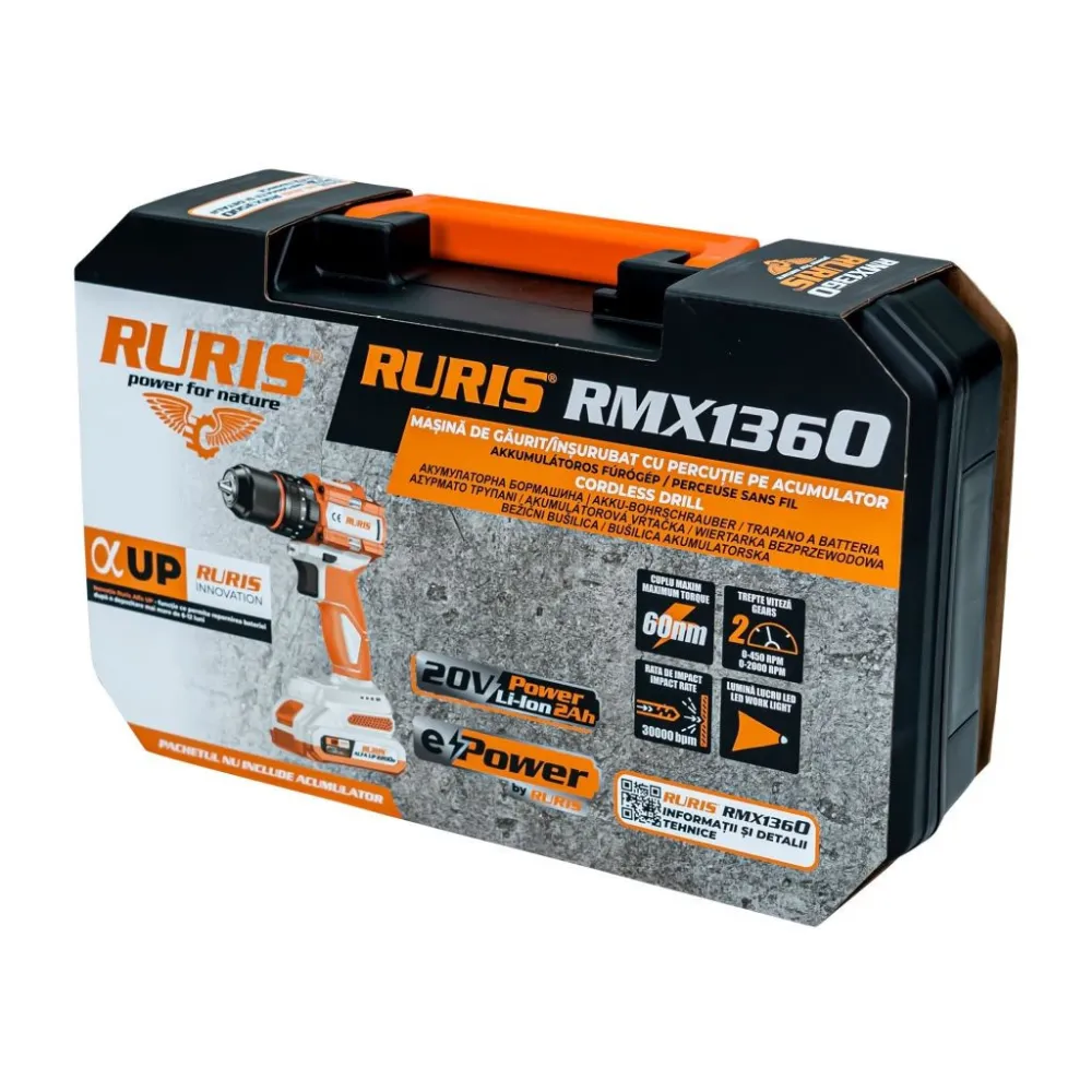 Vďaka svojej schopnosti vykonávať štandardné vŕtanie aj vŕtanie s príklepom je RURIS RMX1360 nevyhnutným prístrojom pre tvrdé materiály, ako je betón alebo murivo, kde príklep uľahčuje prenikanie do materiálu. Všestrannosť pridaných perkusií umožňuje užívateľovi vykonávať širokú škálu úloh s jediným zariadením, čím sa znižuje potreba viacerých nástrojov a šetrí sa čas a námaha. Skrutkovač je napájaný 20 V (2 Ah, 4 Ah a 8 Ah) batériou (nie je súčasťou balenia) a ponúka slobodu pohybu a prenosnosť, čím eliminuje závislosť na elektrickej zásuvke. Užívateľ tak môže pracovať na ťažko dostupných miestach alebo v priestoroch, kde nie sú žiadne zdroje elektrickej energie.