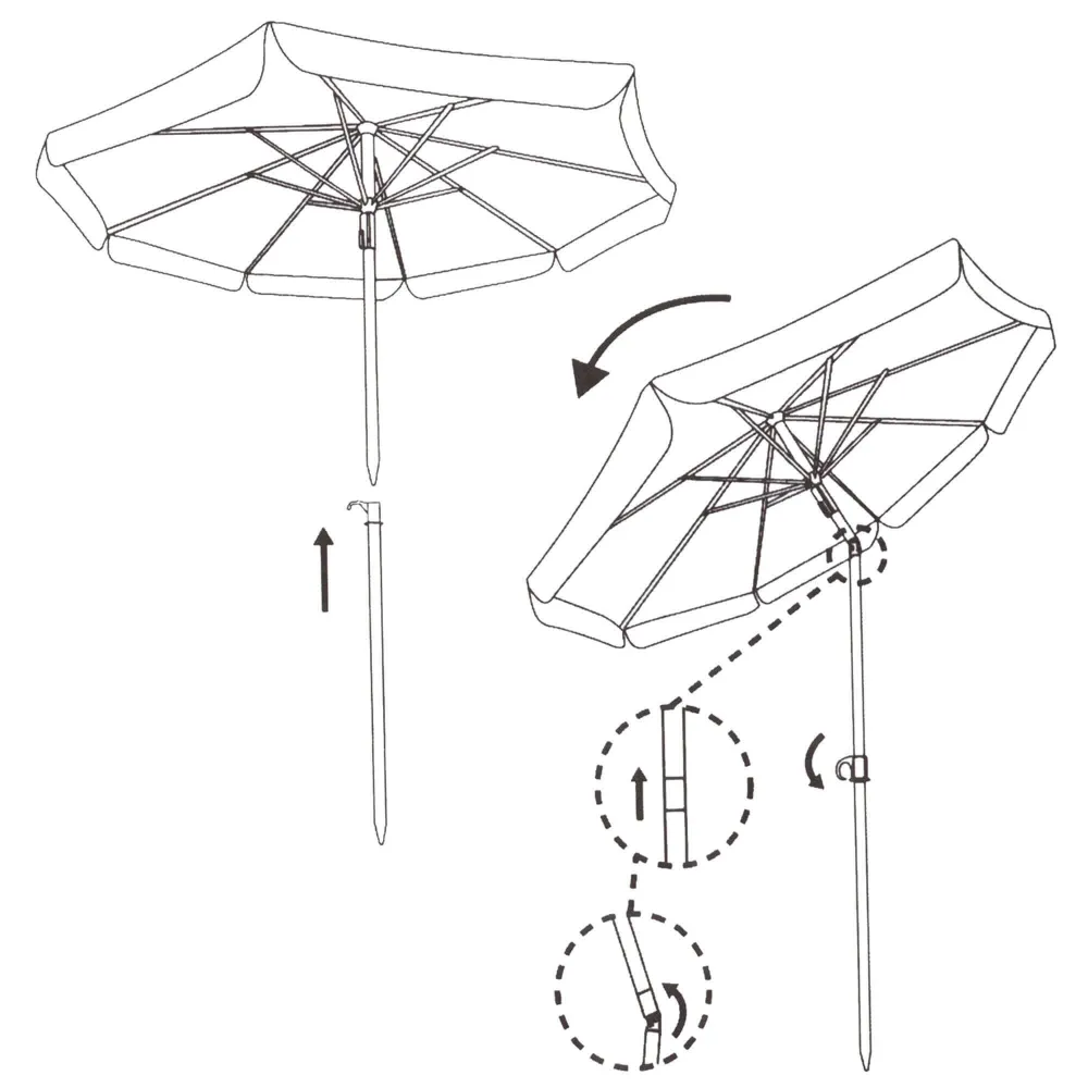 Slnečník sa skladá zo svojej časti , striešky a tyčky. Tie sa vzájomne spájajú pomocou pákového uzáveru. Po zložení slnečník zaberie veľmi málo miesta. Pre ľahkú prepravu aj uskladnenie slúži obal s uchom na prenášanie.