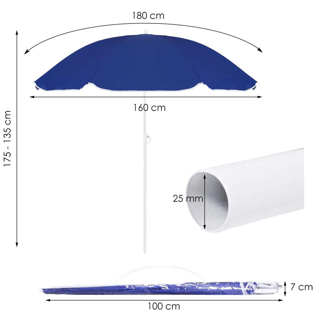 Naklápací slnečník s priemerom 160 cm s odolnou konštrukciou a nepremokavým poťahom. Pri slnečníku je možné nastaviť ako jeho výšku, tak aj sklon striešky. Ideálna na záhradu, balkón, pláž alebo cestovanie.