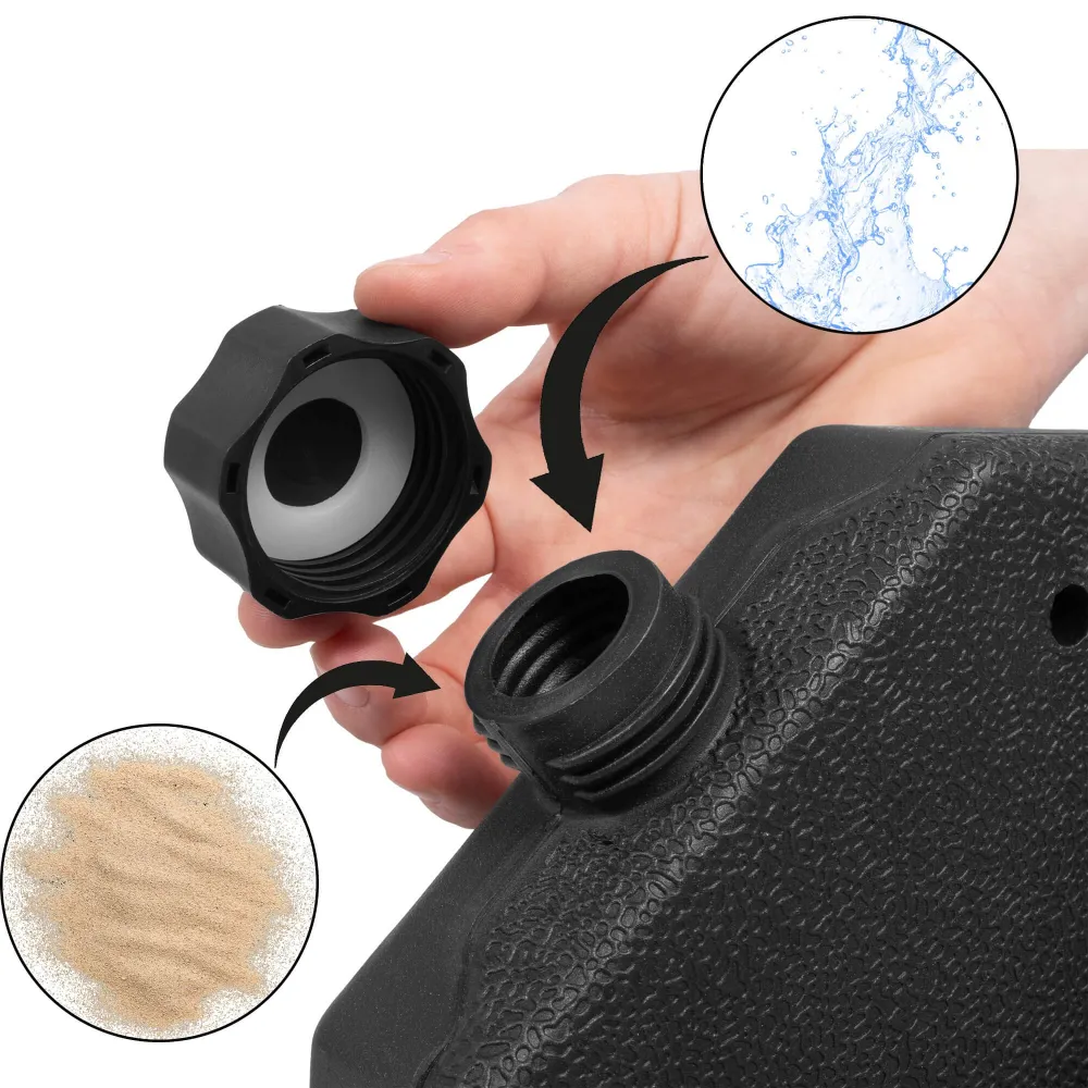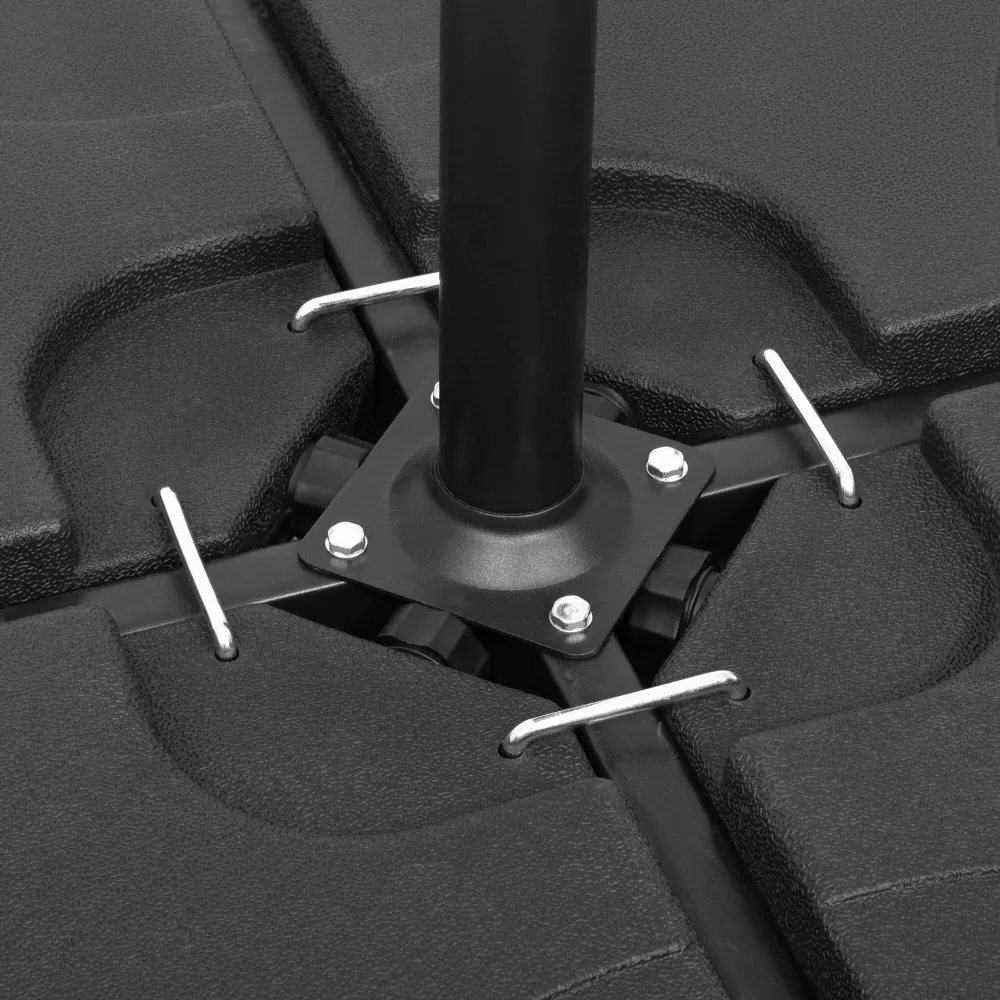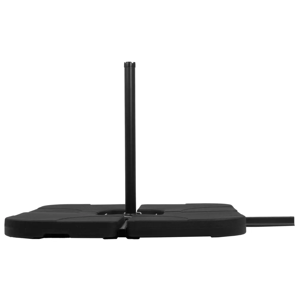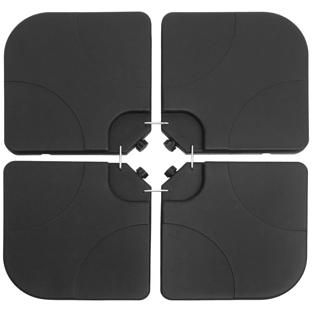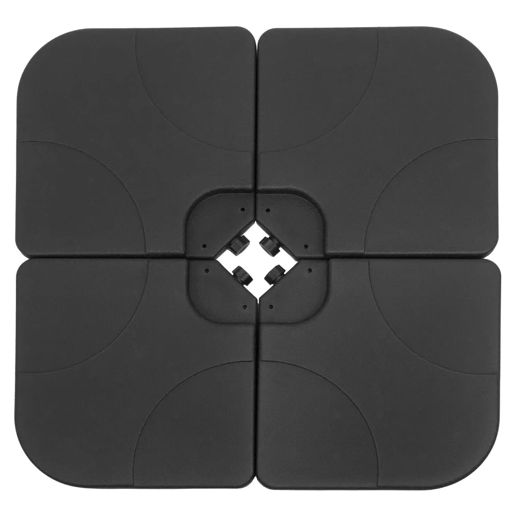 Univerzálna plastová základňa pre slnečníky. Objem 60l, je možné plniť vodou alebo pieskom. Zložená zo štyroch častí, ktoré je možné spojiť do seba. Každá časť vybavená úchytom pre ľahkú manipuláciu. Rozmer 1 časti 50x50x7 cm, rozmer celej základne 103x103x7 cm. Súprava obsahuje kovové kotvy pre stabilné spojenie častí.