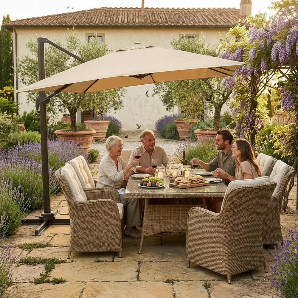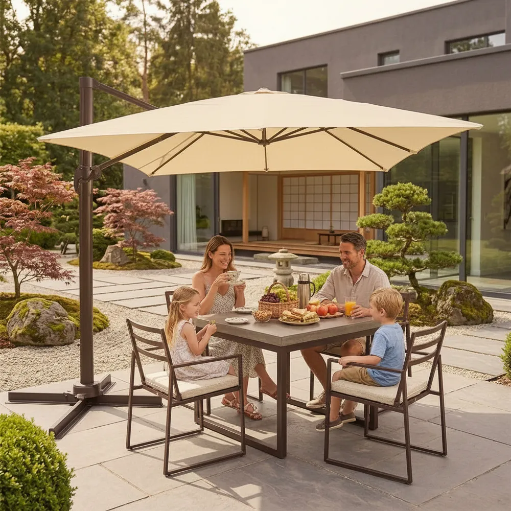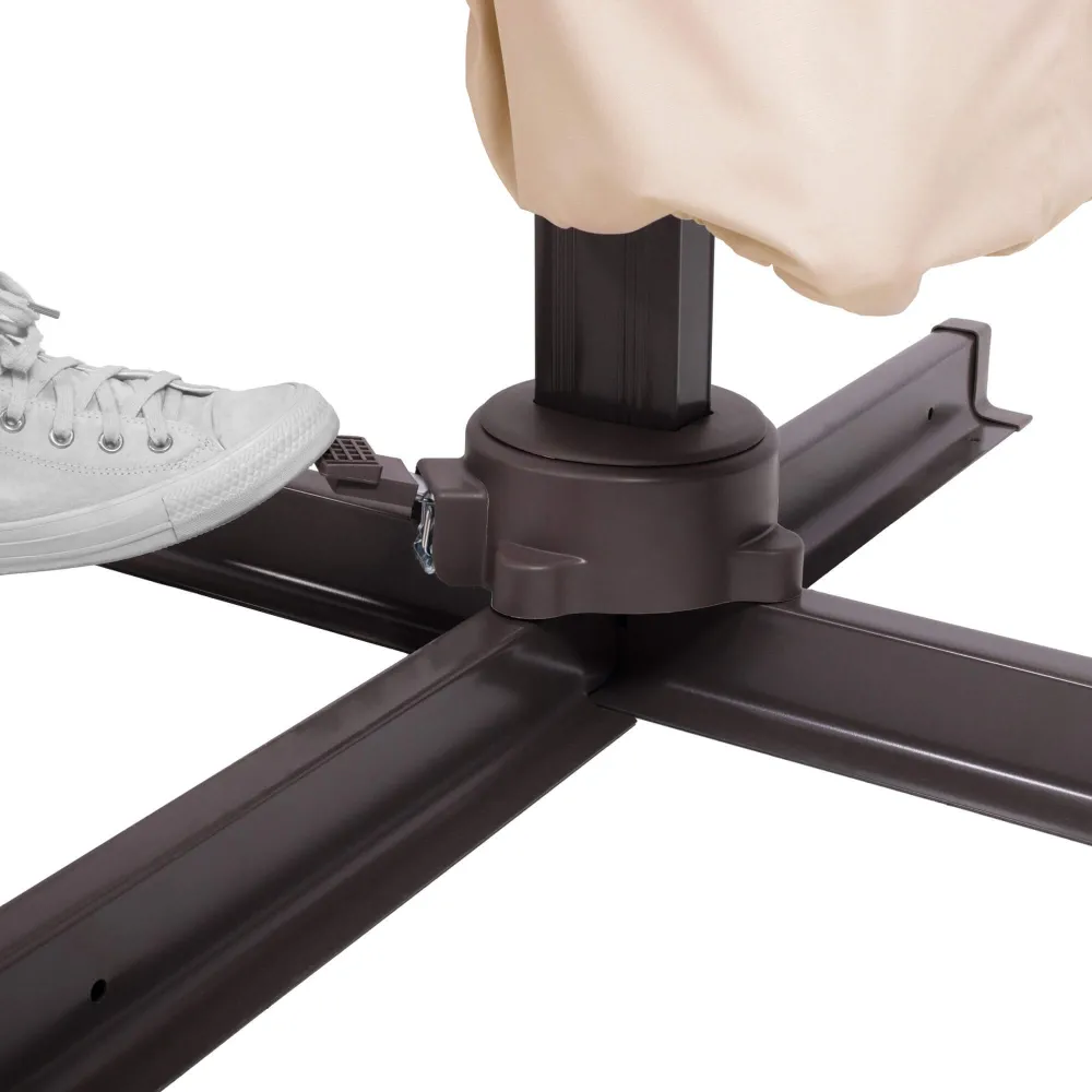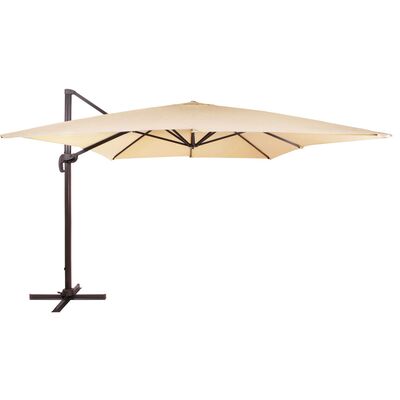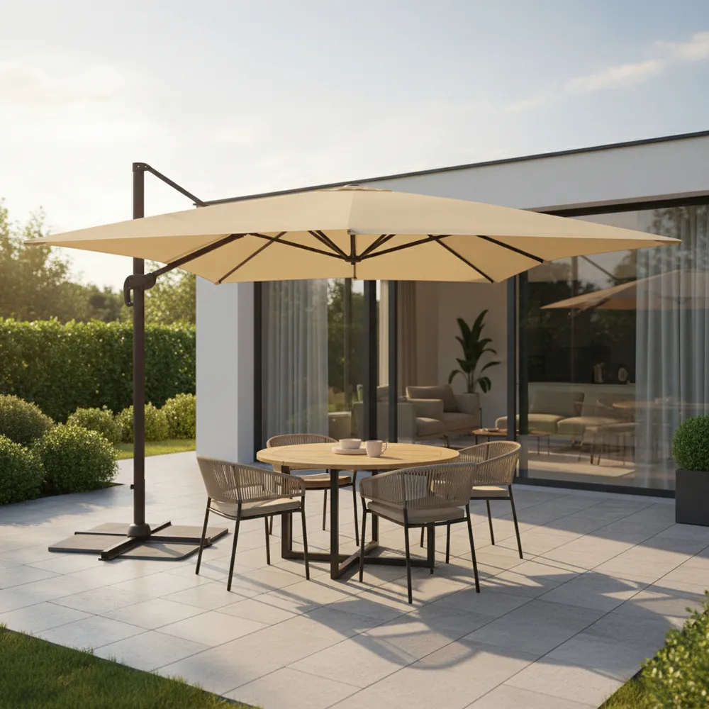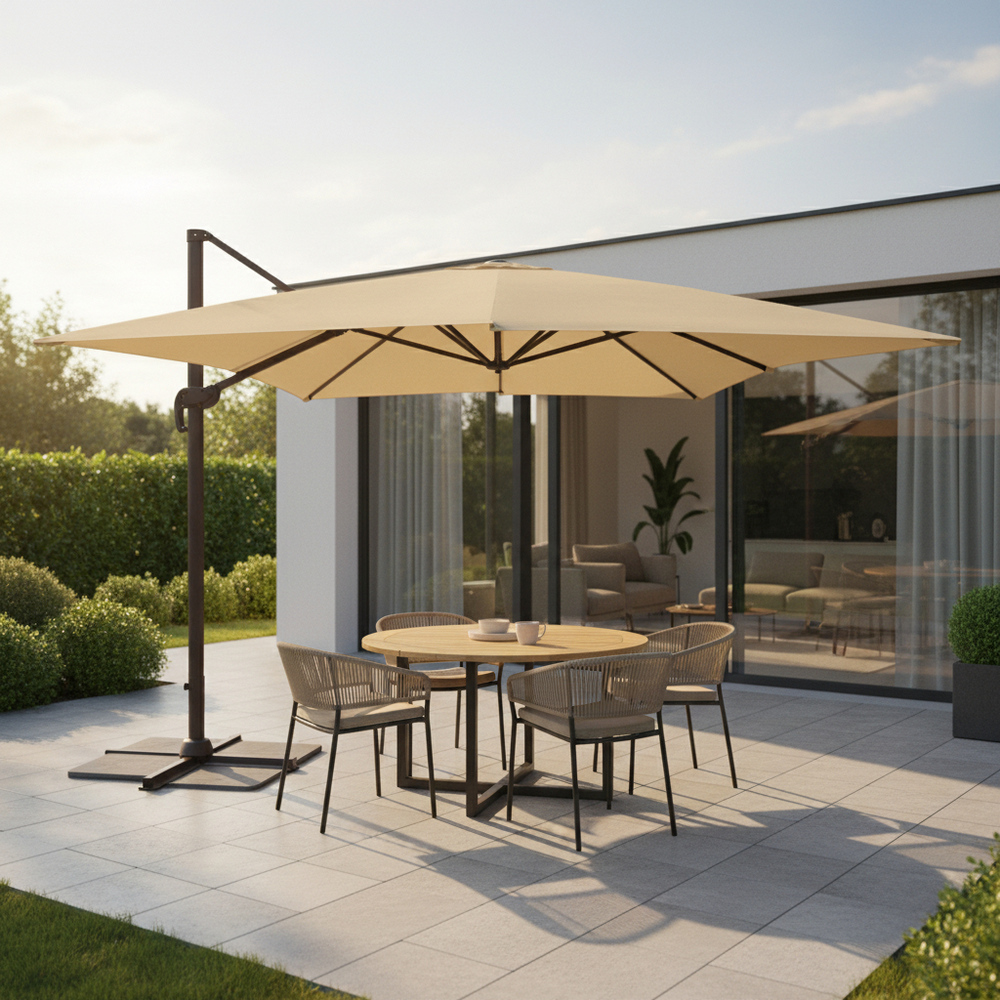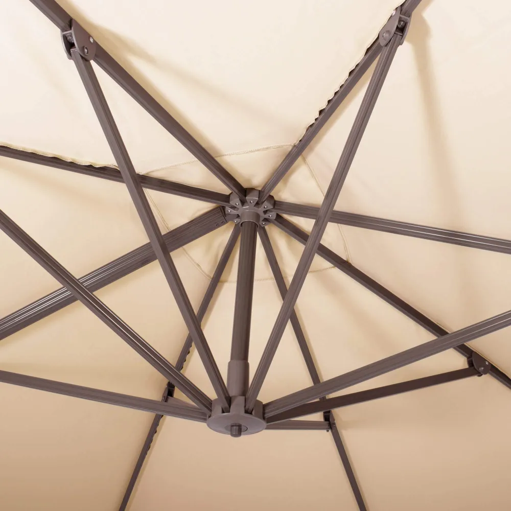 Záhradný slnečník s bočnou nohou s priemerom 485 cm. Vodeodolný materiál, UV filter, nastavenie výšky a uhla sklonu, kľukový mechanizmus, nožný pedál pre ľahké otáčanie, štvorcový tvar. Praktický kryt na slnečník v balení.