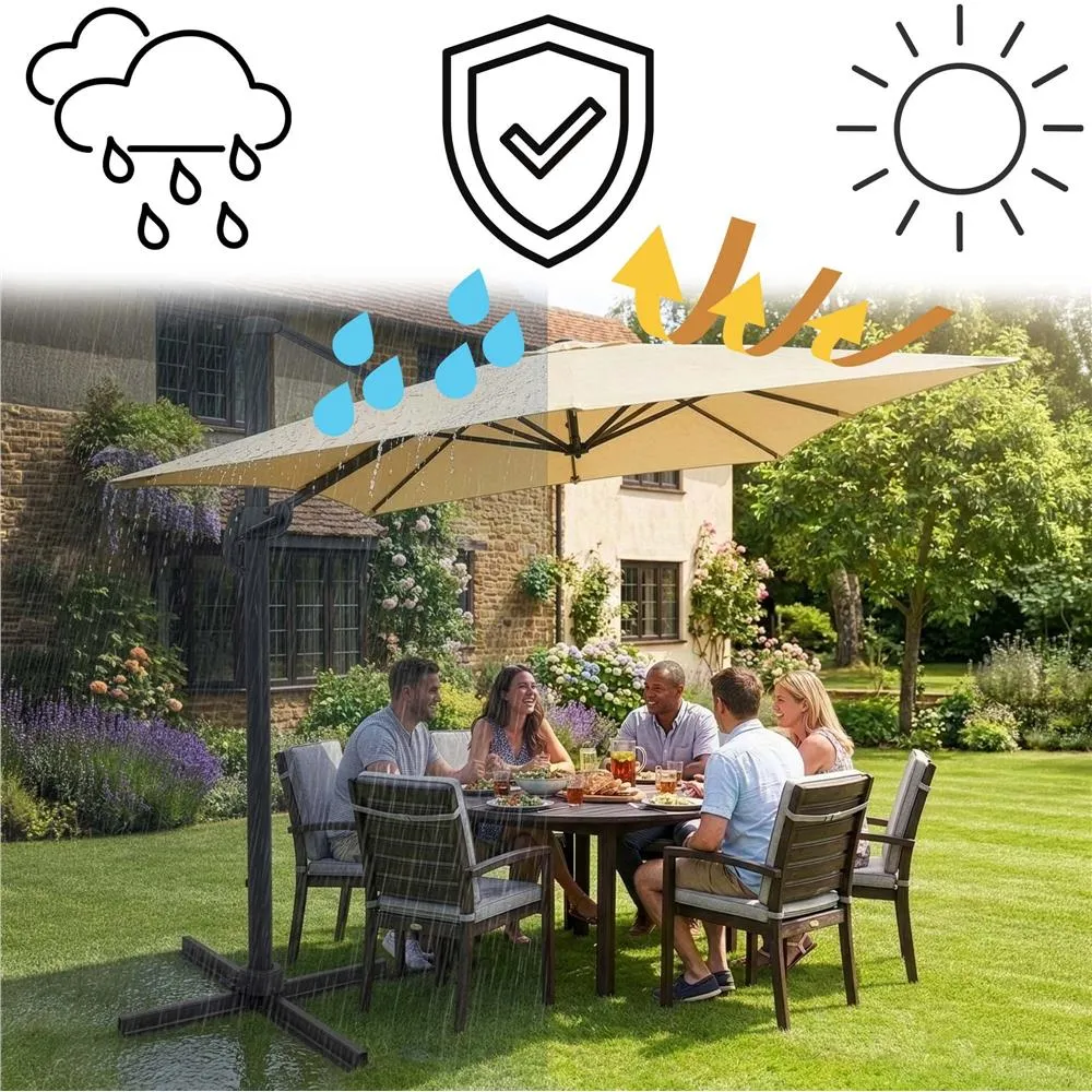 Záhradný slnečník 290x390 cm SPRINGOS MALTA GU0049 v béžovom prevedení je ideálnou voľbou pre tých, ktorí hľadajú spoľahlivé a elegantné zatienenie väčších vonkajších plôch. Vďaka veľkému obdĺžnikovému tvaru poskytuje dostatok tieňa nad jedálenským stolom, lehátkami alebo posedením. Nastaviteľná výška a sklon striešky , spolu s možnosťou otáčania pomocou nožného pedála , umožňujú prispôsobiť polohu slnečníka podľa aktuálnej potreby.