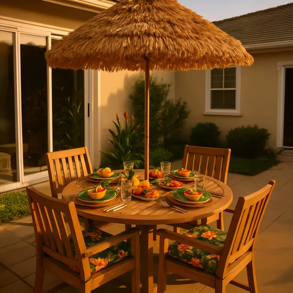 Ľahký a praktický slnečník ideálny na záhradu, balkón aj pláž. Trendy havajský štýl, vrátane obalu na prenášanie. Vďaka nastaviteľnému sklonu a výške ľahko prispôsobíte tieň podľa potreby. Hrot pre zarazenie do zeme zaistí stabilitu bez stojana. Vodeodolná strieška z 8 panelov chráni pred slnkom aj ľahkým dažďom. Kompaktná veľkosť umožňuje ľahké prenášanie a využitie aj ako dáždnik. Priemer 135 cm.
