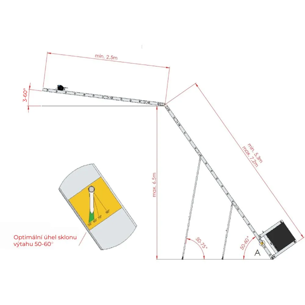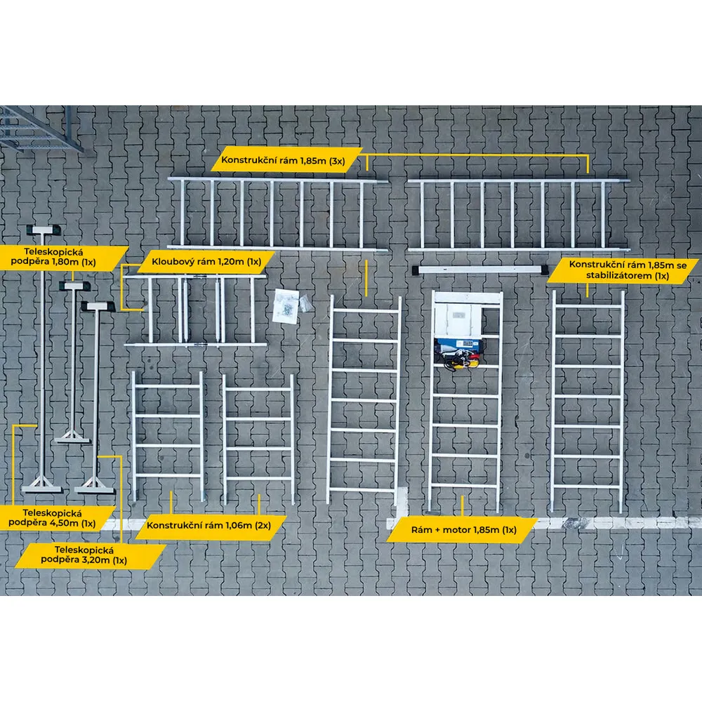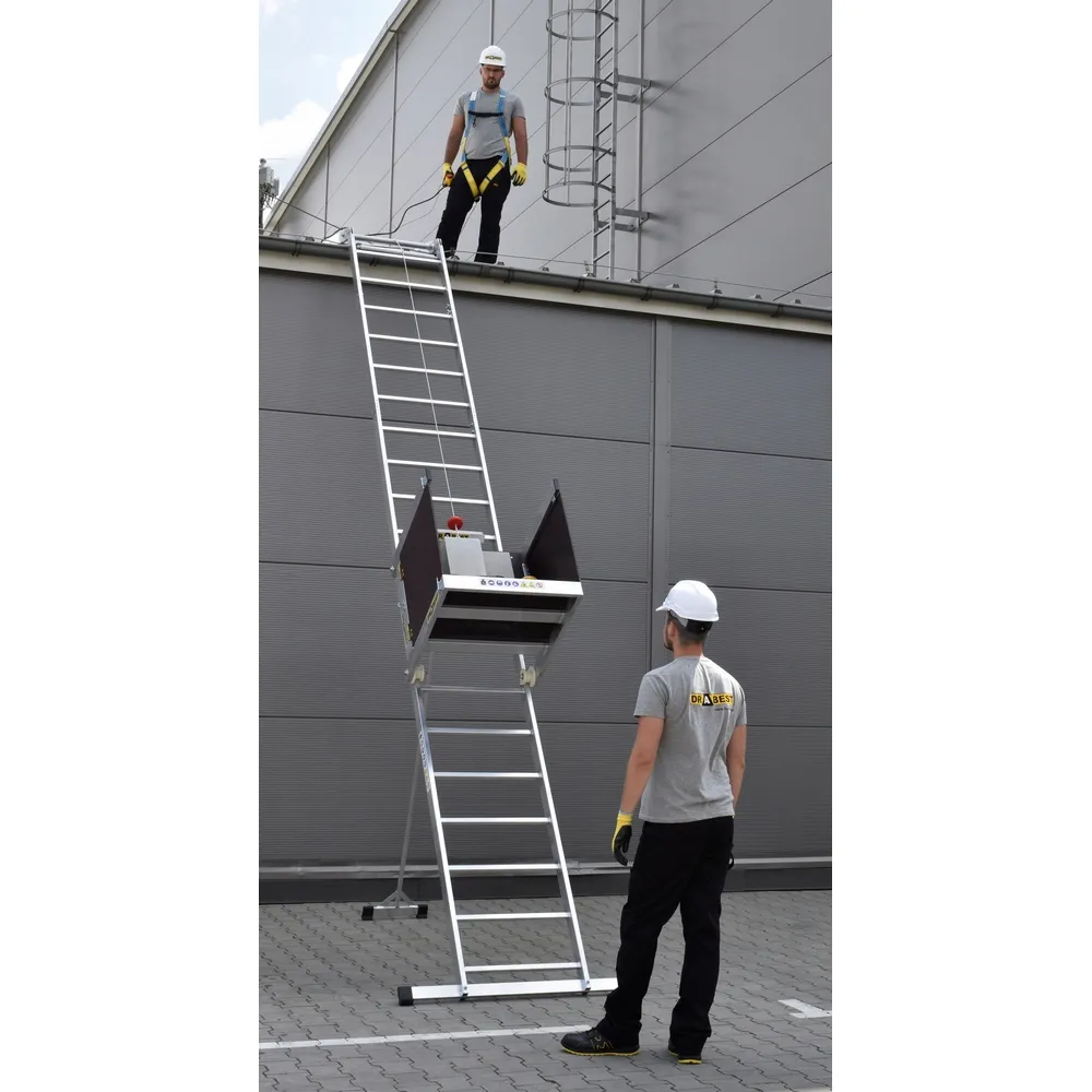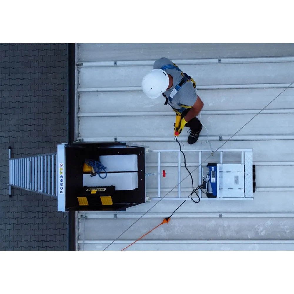 Stavebný strešný výťah s elektrickým navijakom a výkonným motorom umožňuje bezpečný transport bremien do výšky až 12,5m. Modulárna hliníková konštrukcia, rýchla montáž bez náradia a pevné C profily zaisťujú maximálnu flexibilitu. Nosnosť 125 kg, široký stabilizátor a 3× teleskopické podpery pre vysokú stabilitu a bezpečnosť. Hmotnosť setu iba 70 kg.