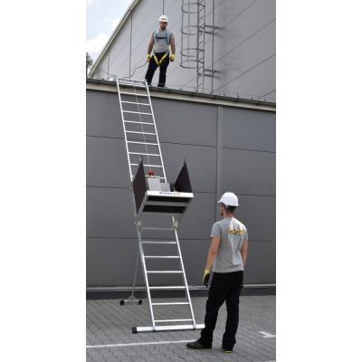 Špeciálny vozík určený pre rebríkové strešné výťahy s robustnou konštrukciou a sklopnými bočnicami na jednoduché nakladanie. Západky zabraňujú samovoľnému otvoreniu, 9mm protišmyková preglejka odoláva vlhkosti aj mechanickému opotrebovaniu. Ideálne pre ťažké a objemné bremená, nosnosť 125 kg, hmotnosť 20 kg. Vhodný na profesionálne použitie na stavbách i montážach.