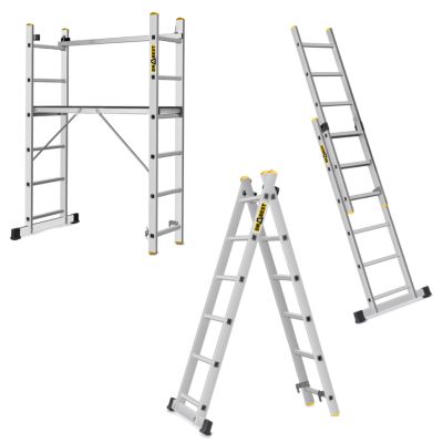 Multifunkčné a univerzálne lešenie 4v1 s pohodlnou pracovnou plošinou z protišmykovej preglejky. Max. pracovná výška 3,68 m, celková výška lešenia 1,61 m, rozmery plošiny 150x50 cm, nosnosť 150 kg. Je možné zostaviť ako lešenie, pracovnú plošinu, výsuvný rebrík alebo štafle. Certifikácia EN 131 na profesionálne použitie.