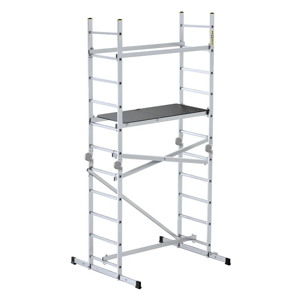 Pojazdné multifunkčné lešenie s maximálnou pracovnou výškou 4 m ponúka vysokú stabilitu, bezpečnosť aj mobilitu. Ľahká hliníková konštrukcia zaisťuje ľahkú manipuláciu, kĺbový systém umožňuje prispôsobenie rôznym pracovným podmienkam. Rýchla montáž a demontáž bez námahy. Certifikácia EN 131 na profesionálne použitie. Nosnosť 150 kg.