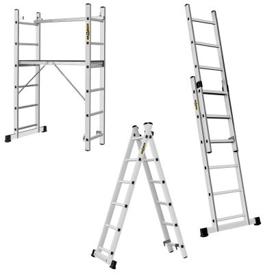 Multifunkčné a univerzálne lešenie 4v1 s pohodlnou pracovnou plošinou z protišmykovej preglejky. Max. pracovná výška 3,68 m, celková výška lešenia 1,61 m, rozmery plošiny 114x34 cm, nosnosť 150 kg. Je možné zostaviť ako lešenie, pracovnú plošinu, výsuvný rebrík alebo štafle. Certifikácia EN 131 pre domáce použitie.