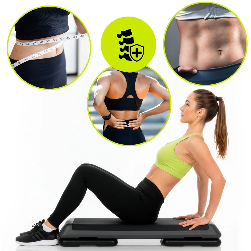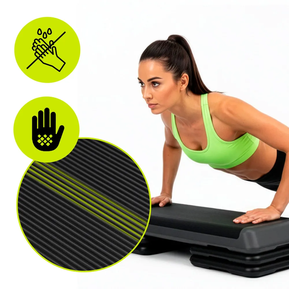 Aeróbny step debnička pre efektívny kardio tréning a posilnenie dolnej časti tela. Veľká plocha na bezpečné cvičenie. Nastaviteľná výška v 3 stupňoch 10, 14,5 a 19,5 cm. Protišmykový povrch dosky pre istý krok. Protišmykové nožičky pre stabilitu. Robustná konštrukcia na dlhodobé používanie doma aj vo fitku.