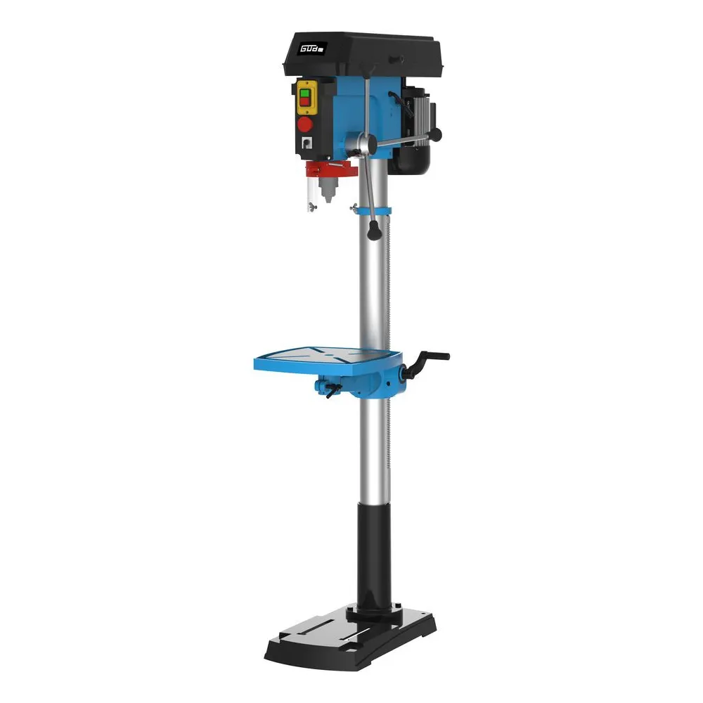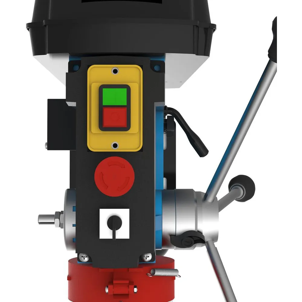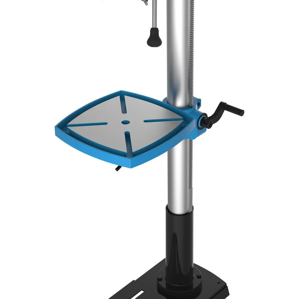 Stĺpová vŕtačka s pohonom klinovým remeňom, nastavenie rýchlosti pomocou stupňovitej remenice. Systém napínania klinových remeňov. Vŕtacie vreteno uložené v guličkových ložiskách. Rýchloupínacie skľučovadlo 3-16 mm, uchytenie vretena MT3 a kužeľ skľučovadla B16. Vypínač so spínačom nulového napätia, pravý / ľavý chod. Pracovný stôl s odtokovými kanálikmi na chladiacu kvapalinu, sklápacia ochrana proti pilinám. Vŕtací stôl výškovo nastaviteľný, sklopný +/- 45 ° a otočný o 360 °. Nastaviteľný hĺbkový doraz vŕtania na presné vŕtanie.