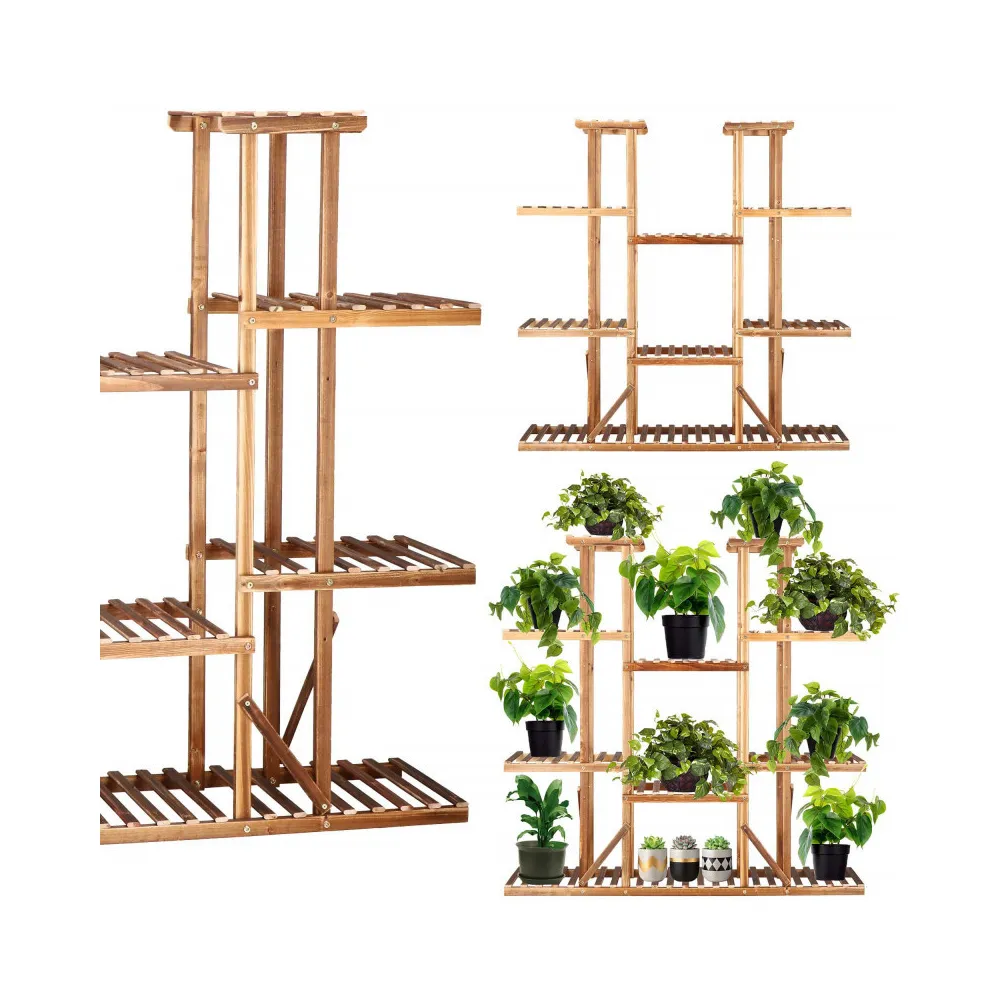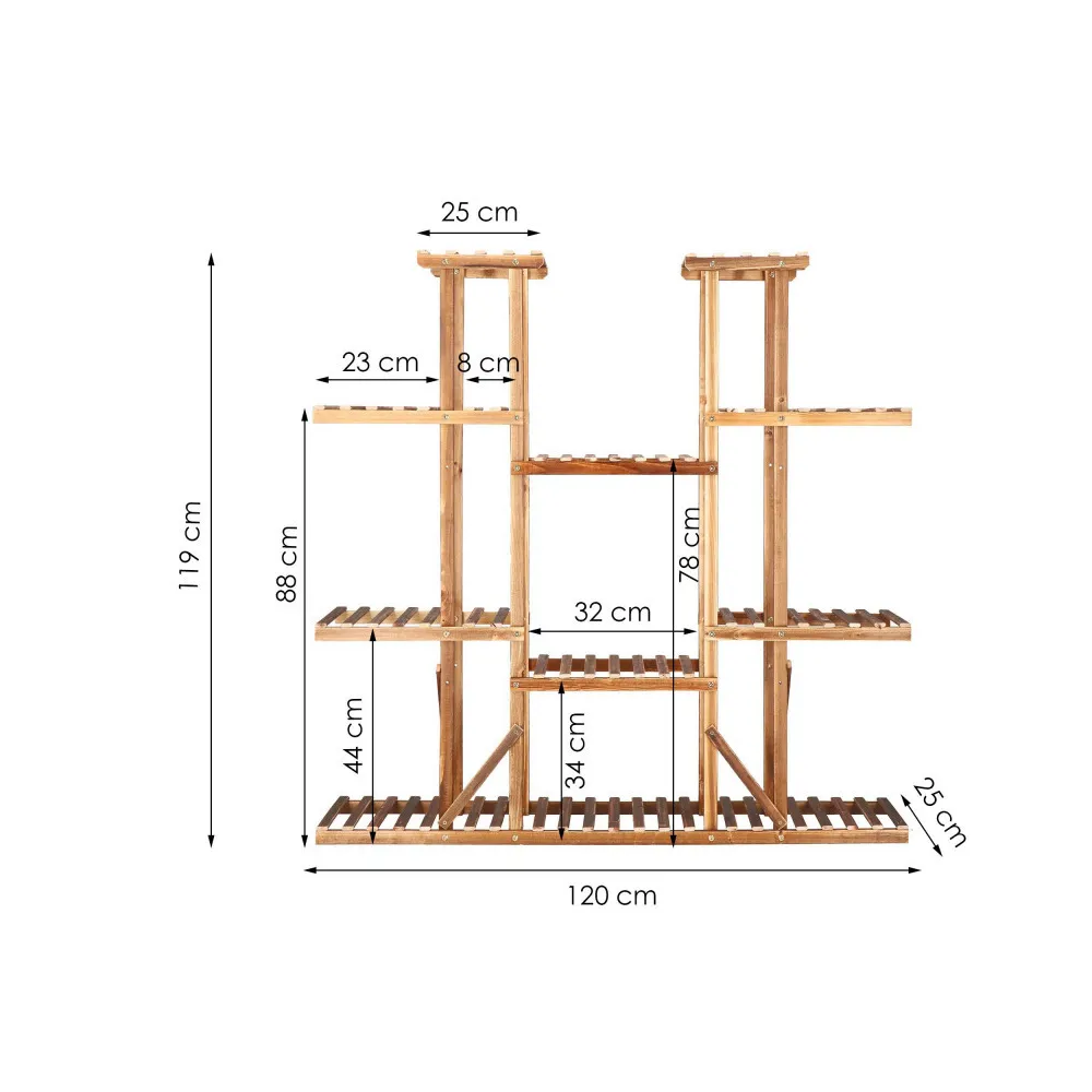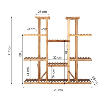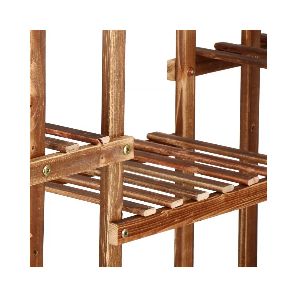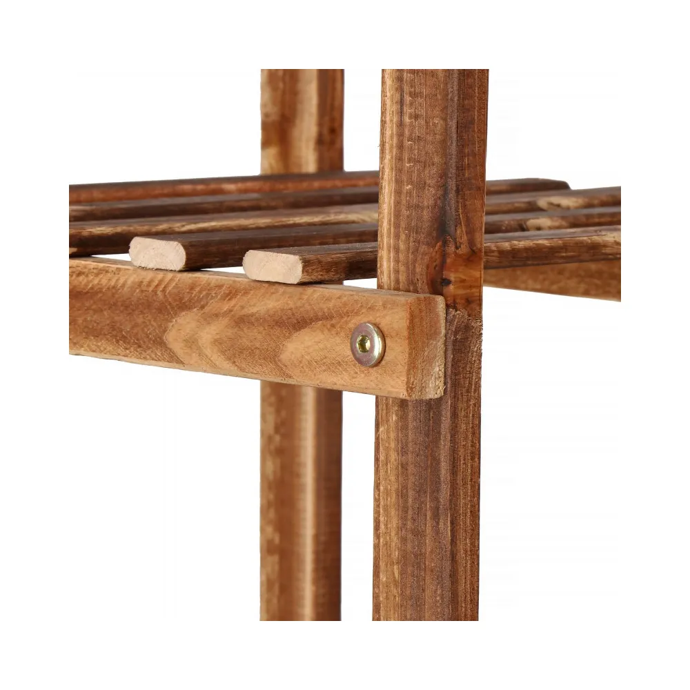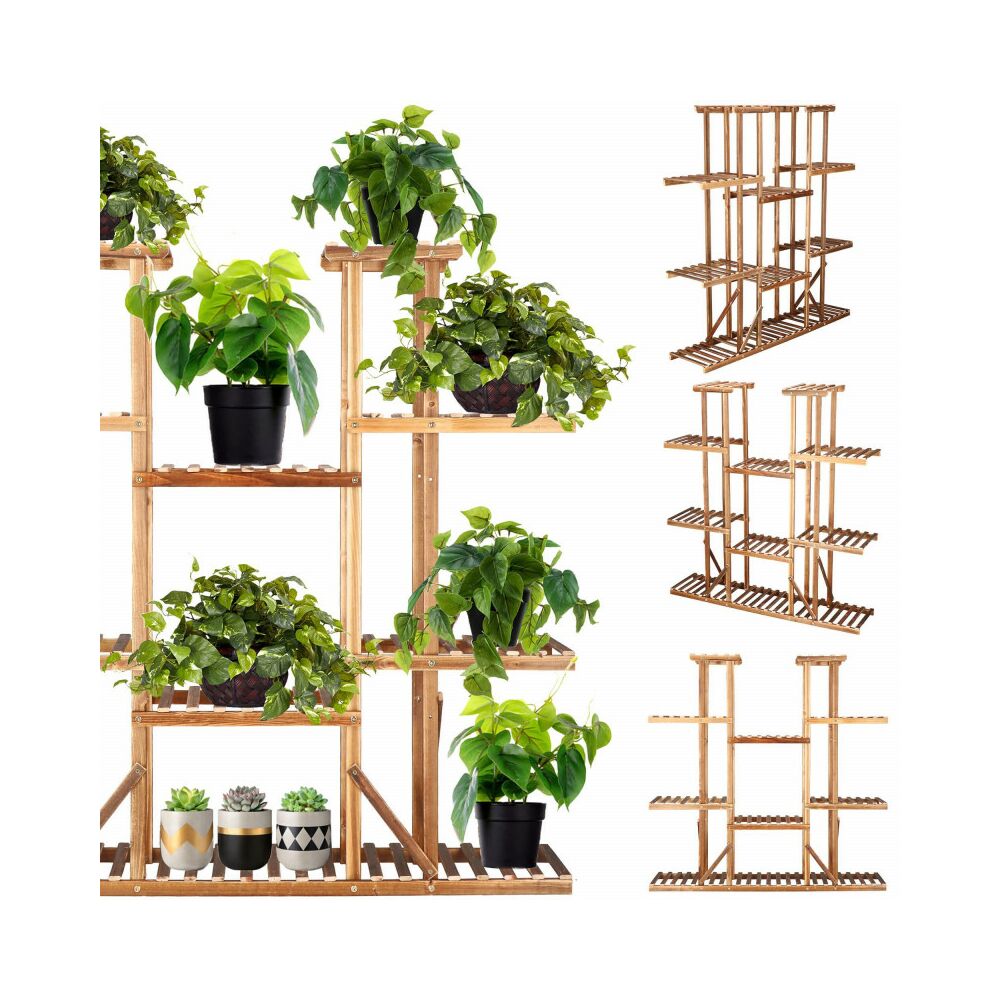 Viacúrovňový stojan až na 12 kvetov s drevenými poličkami. Kvalitné spracovanie, prírodný drevený materiál. Jednoduchá montáž, ľahký dizajn, univerzálne farby. Moderný štýl, vhodný do akéhokoľvek interiéru alebo exteriéru. 6 rôznych poschodí. Vytvorte si svoju vlastnú kompozíciu kvetov.