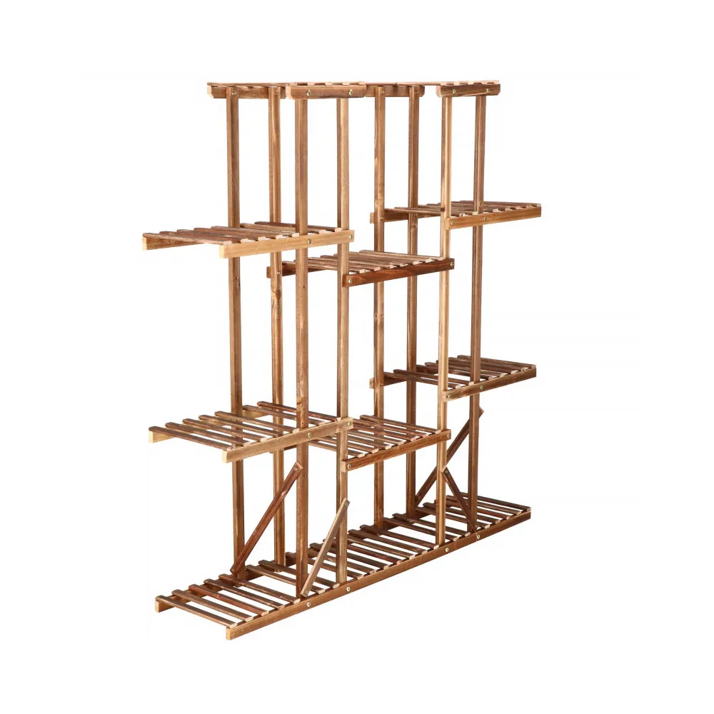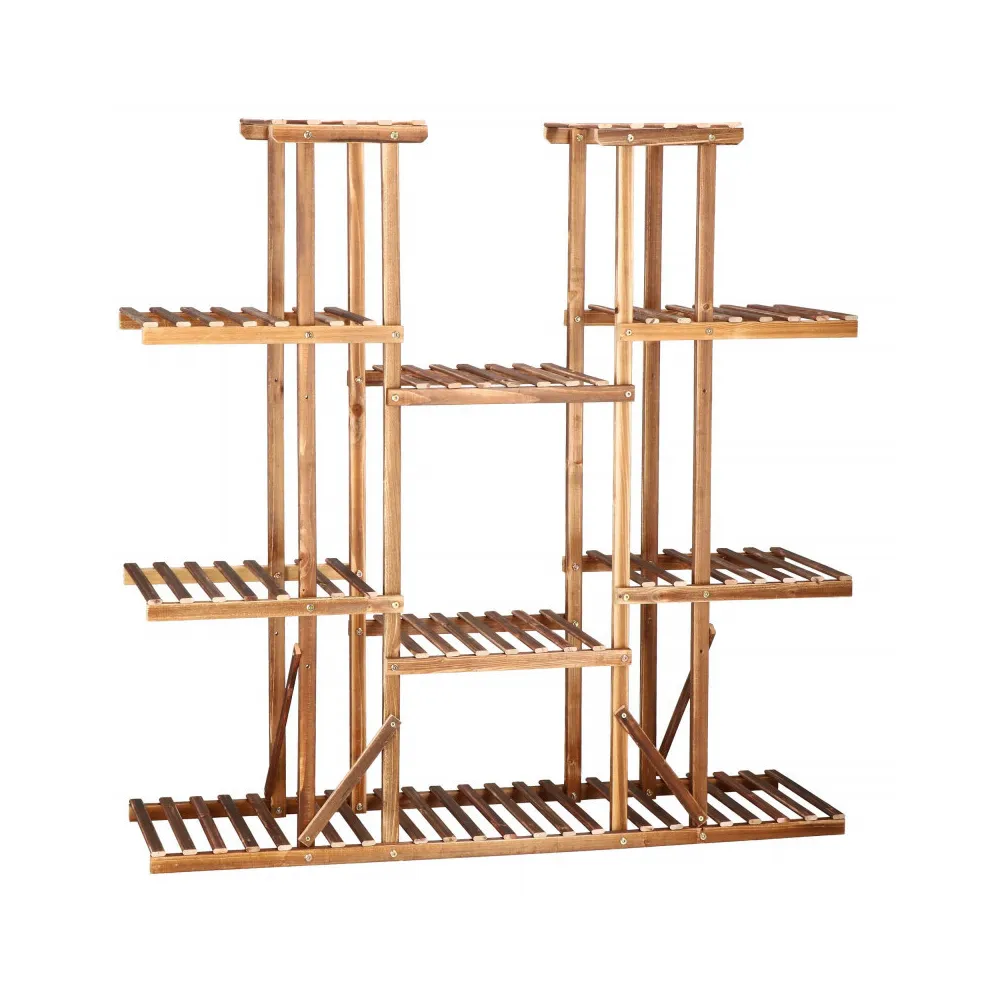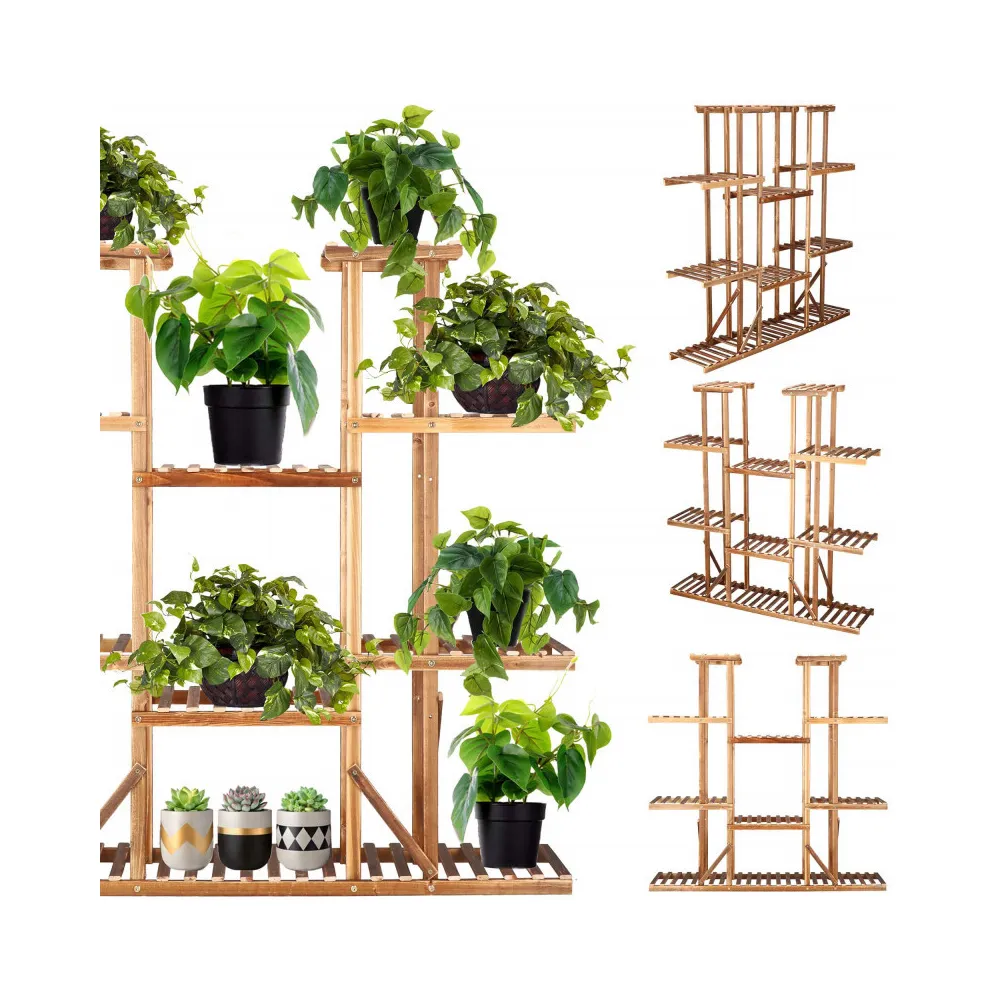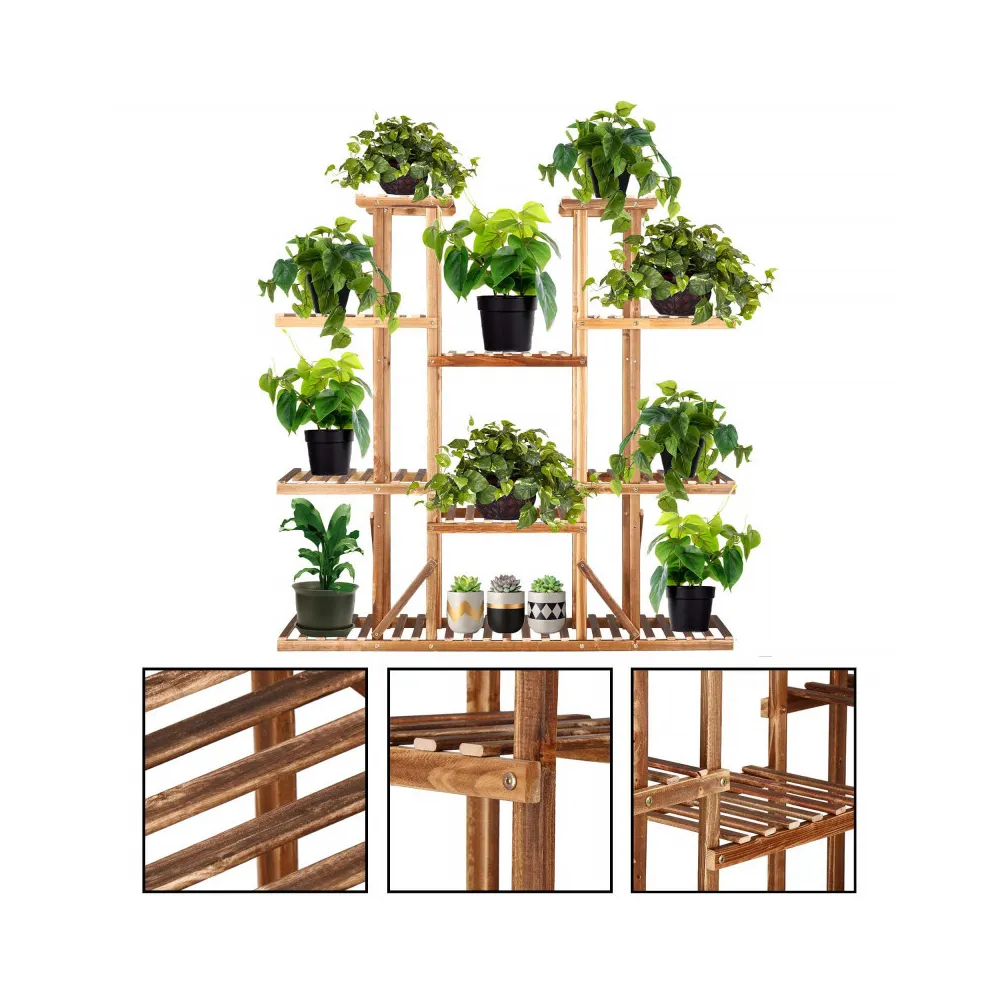 Viacúrovňový stojan až na 12 kvetov s drevenými poličkami. Kvalitné spracovanie, prírodný drevený materiál. Jednoduchá montáž, ľahký dizajn, univerzálne farby. Moderný štýl, vhodný do akéhokoľvek interiéru alebo exteriéru. 6 rôznych poschodí. Vytvorte si svoju vlastnú kompozíciu kvetov.