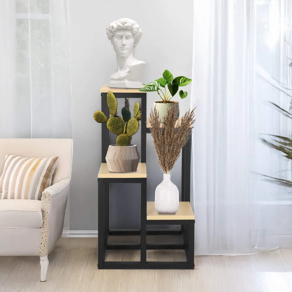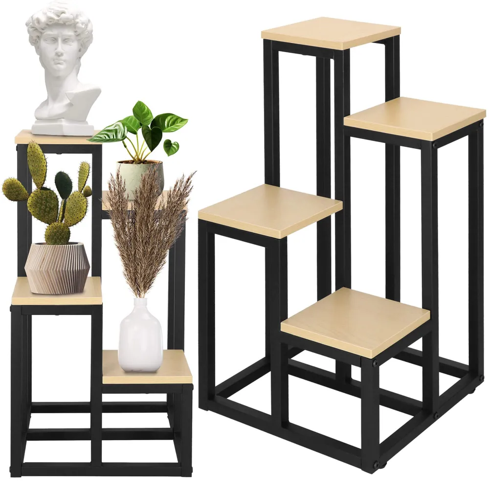 Regál na kvety je ideálnym riešením pre malé priestory - ponúkne 4 miesta pre kvetináče, takže môžete pestovať viac rastlín pohromade. Kovový stojan na kvety vyniká ľahkou konštrukciou, jednoduchým zostavením a univerzálnymi farbami. Čierny rám s matnou úpravou a drevené police pôsobia elegantne a zároveň odolne.