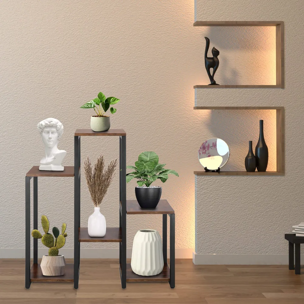 Regál na kvety je ideálnym riešením pre malé priestory - ponúkne 6 miest pre kvetináče, takže môžete pestovať viac rastlín pohromade. Kovový stojan na kvety vyniká ľahkou konštrukciou, jednoduchým zostavením a univerzálnymi farbami. Čierny rám s matnou úpravou a drevené police pôsobia elegantne a zároveň odolne.
