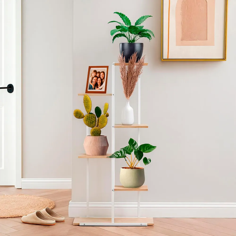 Kovový stojan na kvety 113 cm SPRINGOS GA0212 biely prináša do interiéru pokojnú eleganciu a prirodzenú harmóniu. Vďaka šiestim úrovniam umožňuje vytvoriť vyváženú kompozíciu kvetov aj dekorácií a podčiarknuť charakter priestoru. Kombinácia kovu a drevených políc pôsobí hrejivo a zároveň moderne, takže stojan ľahko zapadne do obývacej izby, predsiene aj pracovne. Úzke prevedenie šetrí miesto a umožňuje jeho umiestnenie aj do menších interiérov.