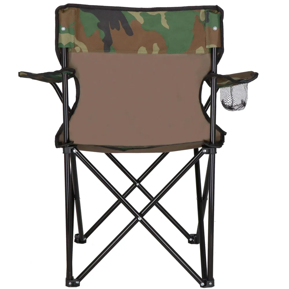 Pohodlné skladacie kreslo v maskáčovom dizajne, štýl kempingovej/turistickej/rybárskej. Ponúka odolnú kovovú konštrukciu, pevnú textilnú látku, nastaviteľné lakťové opierky a úchyt na fľašu. Vďaka stabilným nohám s možnosťou uchytenia do zeme a jednoduchému systému skladania je ideálnou voľbou do terénu. Súčasťou je praktická transportná taška. Nosnosť 120 kg.