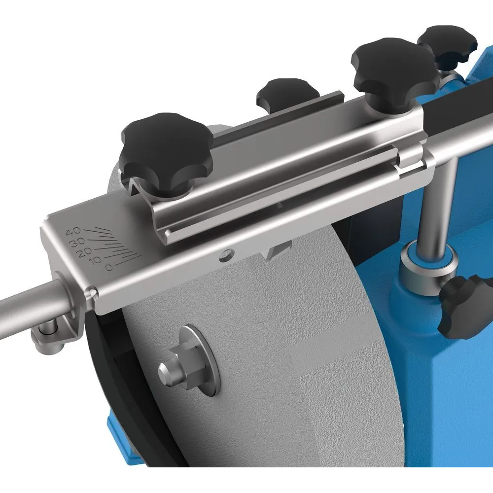 Stolová brúska ideálna na brúsenie sekier, nožníc, nožov rôznej dĺžky a šírky čepele, drážkovača rôzneho tvaru, rýle, hoblíky. Brúsny hriadeľ uložený v guličkových ložiskách, brúsny kotúč zo zušľachteného korundu, vhodný pre nástrojovú oceľ nad 60 HRC, indukčný motor, chod bez vibrácií, plynulé nastavenie otáčok "Vario Speed", prestaviteľné dorazy, 2 rôzne smery otáčania, nádrž na vodu