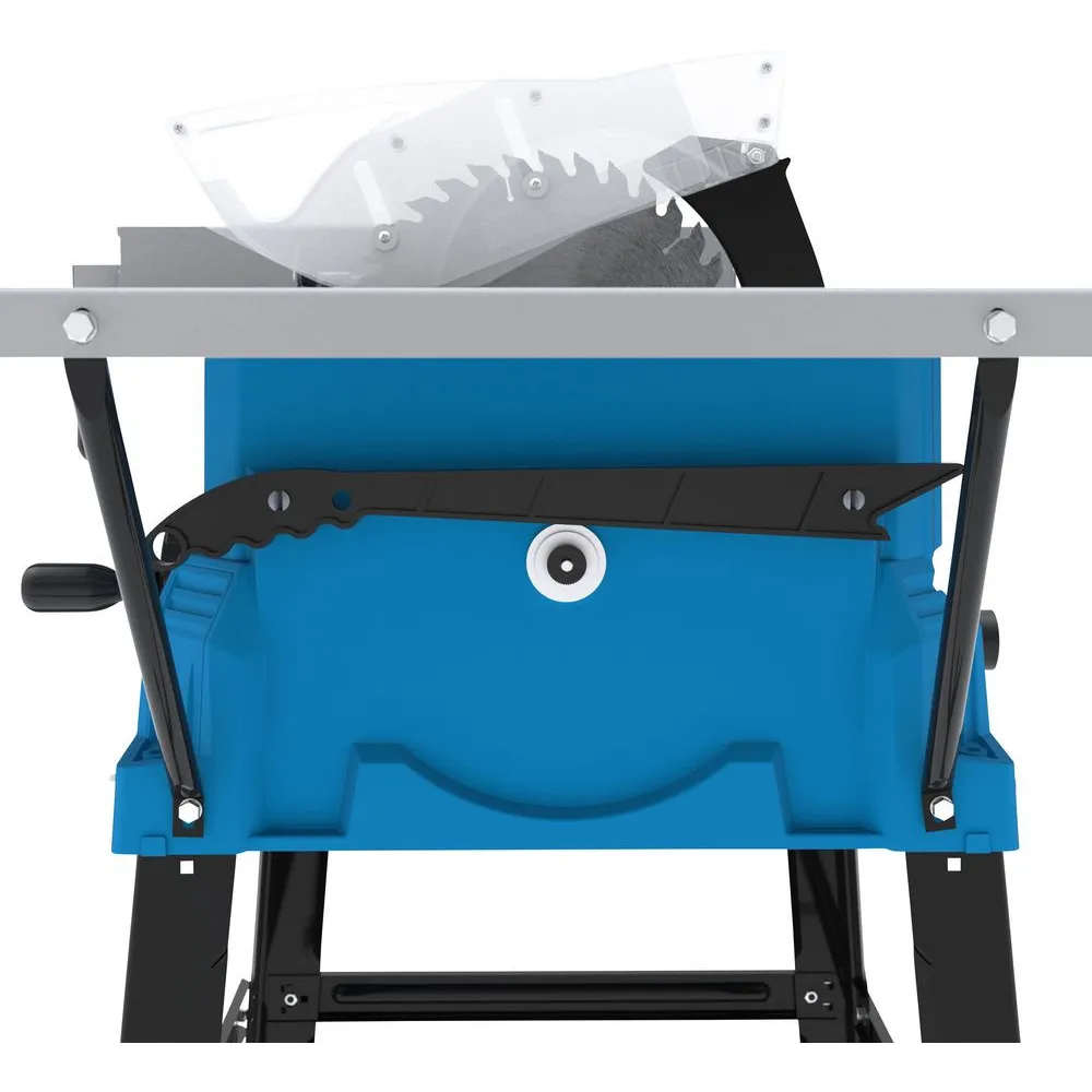 Stolová kotúčová píla s pracovným stolom z oceľového plechu, plastový kryt, podstavec z ocele. Dva rozšírenia, zošikmený doraz, paralelný doraz, posuvná tyč s držiakom, dorazová lišta s milimetrovou stupnicou. Možnosť nastavenia výšky s nastavením zošikmenia pomocou kľučky.