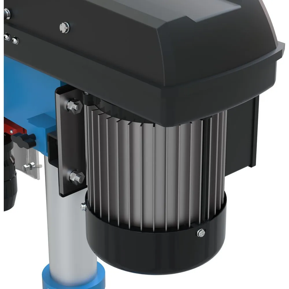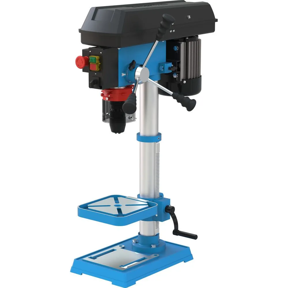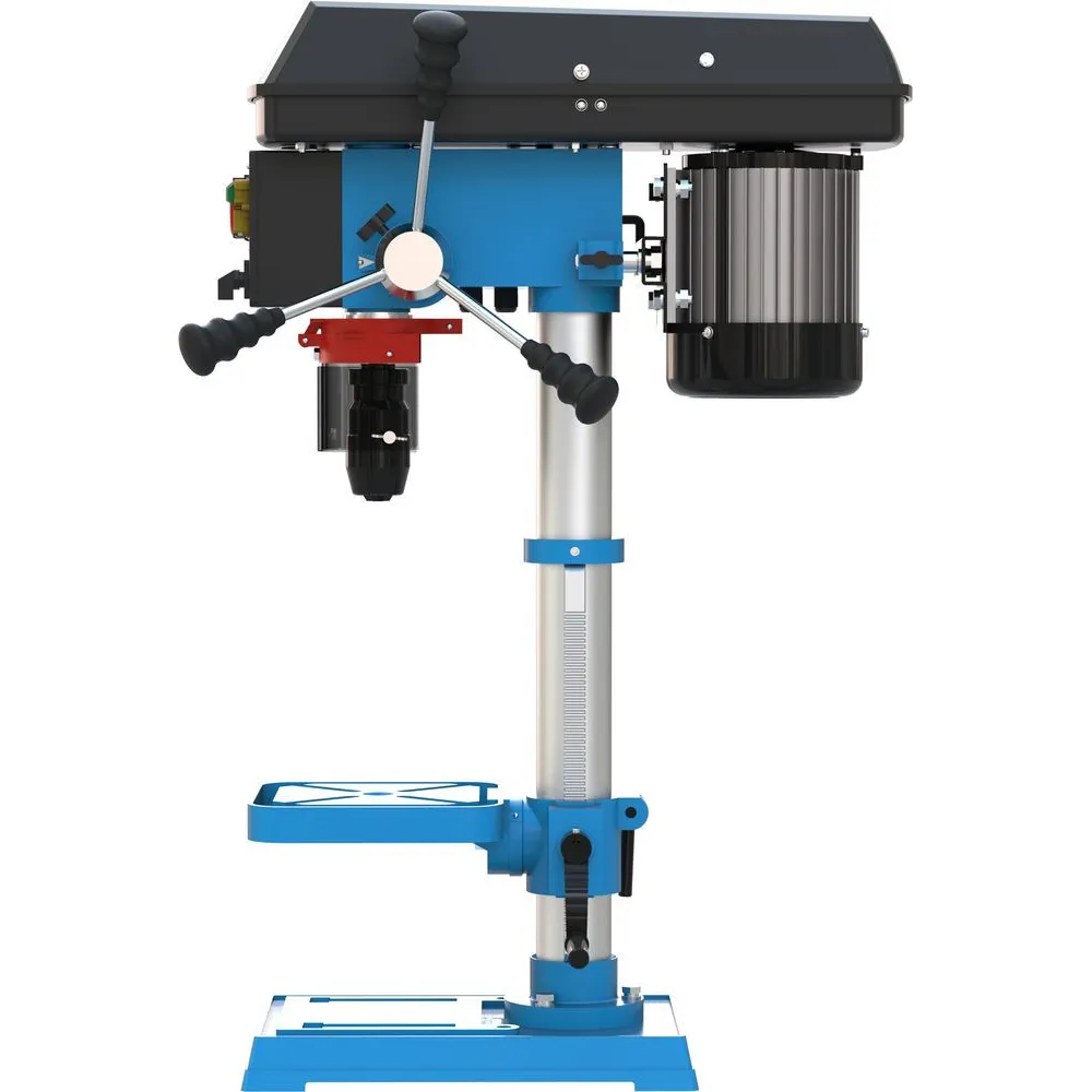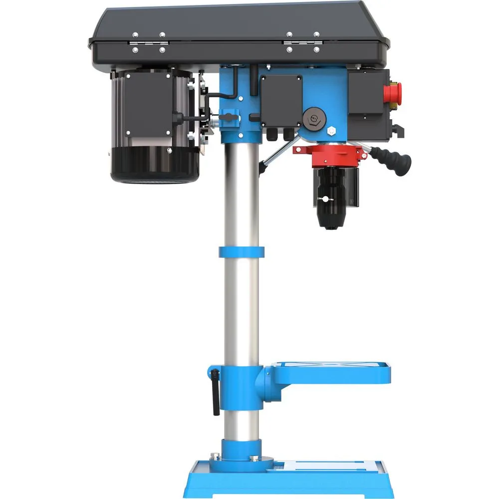 Stolová vŕtačka s pohonom klinovým remeňom, nastavenie rýchlosti pomocou stupňovitej remenice. Systém napínania klinového remeňa. Vŕtacie vreteno uložené v guličkových ložiskách. Vypínač so spínačom nulového napätia. Pravý/ľavý chod. Sklápacia ochrana proti pilinám. Vŕtací stôl výškovo nastaviteľný, sklopný o +/- 45 ° a otočný o 360 °, s odtokovými kanálikmi na chladiacu kvapalinu. Nastaviteľný hĺbkový doraz vŕtania na presné vŕtanie.