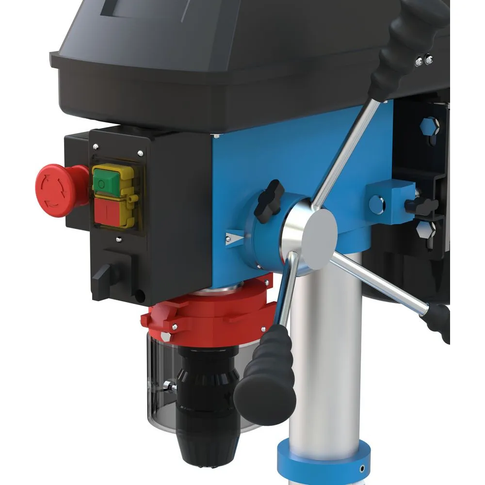 Stolová vŕtačka s pohonom klinovým remeňom, nastavenie rýchlosti pomocou stupňovitej remenice. Systém napínania klinového remeňa. Vŕtacie vreteno uložené v guličkových ložiskách. Vypínač so spínačom nulového napätia. Pravý/ľavý chod. Sklápacia ochrana proti pilinám. Vŕtací stôl výškovo nastaviteľný, sklopný o +/- 45 ° a otočný o 360 °, s odtokovými kanálikmi na chladiacu kvapalinu. Nastaviteľný hĺbkový doraz vŕtania na presné vŕtanie.