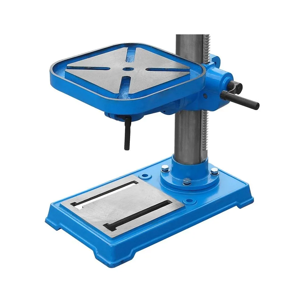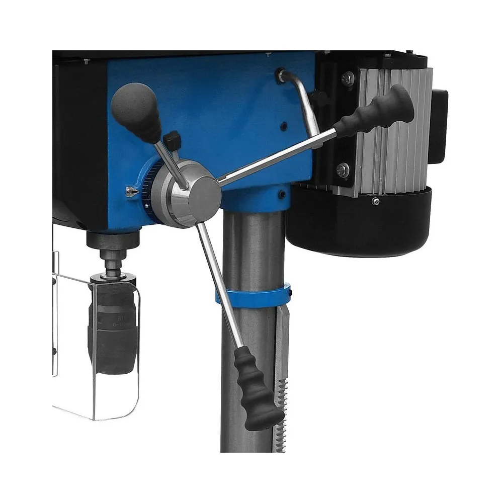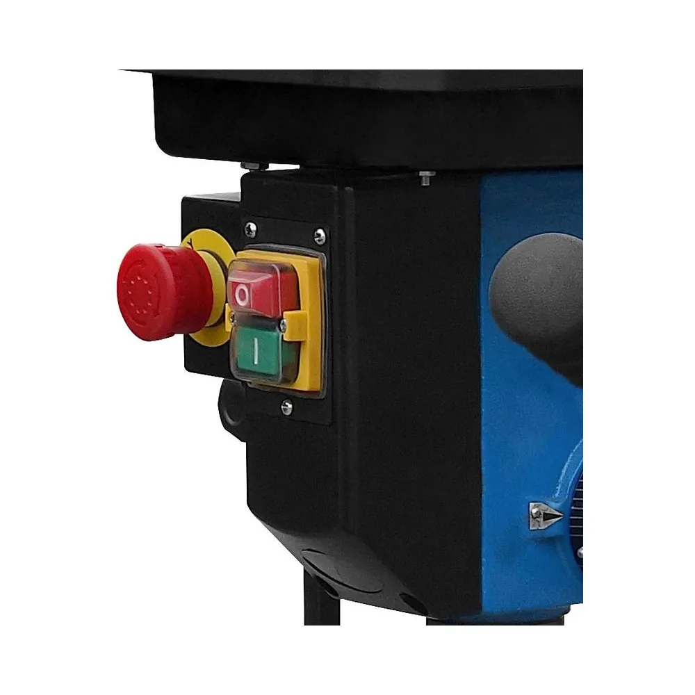 Stolová vŕtačka s pohonom klinovým remeňom, nastavenie rýchlosti pomocou stupňovitej remenice. Systém napínania klinového remeňa. Vŕtacie vreteno uložené v guličkových ložiskách. Vypínač so spínačom nulového napätia. Núdzový vypínač. Sklápacia ochrana proti pilinám s mikrospínačom. Vŕtací stôl výškovo nastaviteľný, sklopný o +/- 45 ° a otočný o 360 °, s odtokovými kanálmi pre chladiacu kvapalinu. Nastaviteľný hĺbkový doraz vŕtania na presné vŕtanie.