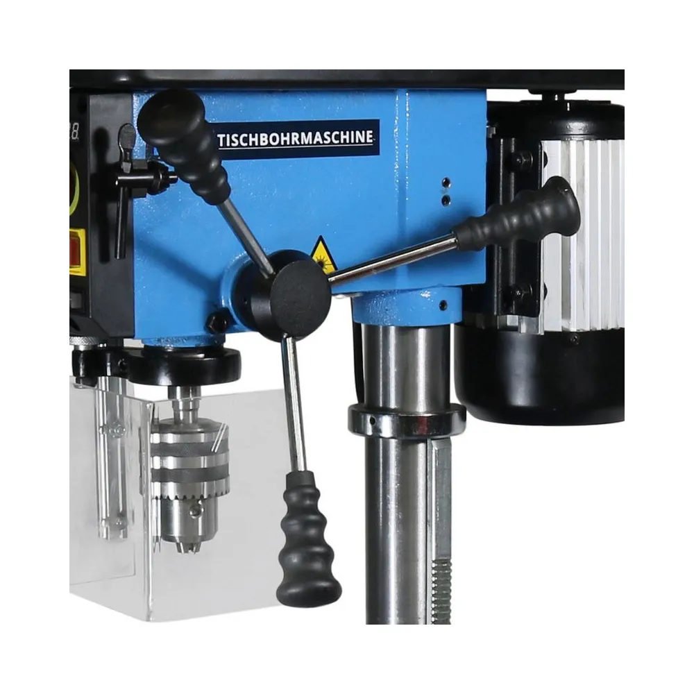 Stolová vŕtačka s pohonom klinovým remeňom s plynulým nastavením rýchlosti. Systém napínania klinových remeňov. Polohovací laser. Digitálne zobrazenie rýchlosti. Vŕtacie vreteno uložené v guličkových ložiskách. Vypínač so spínačom nulového napätia. Núdzový vypínač. LED pracovné svetlo. Vysoká presnosť hádzania vretena (<0,02 mm). Pracovný stôl s odtokovými kanálikmi na chladiacu kvapalinu, sklápacia ochrana proti pilinám s mikrospínačom. Vŕtací stôl výškovo nastaviteľný, sklopný +/- 45 ° a otočný o 360 °. Nastaviteľný hĺbkový doraz vŕtania na presné vŕtanie.