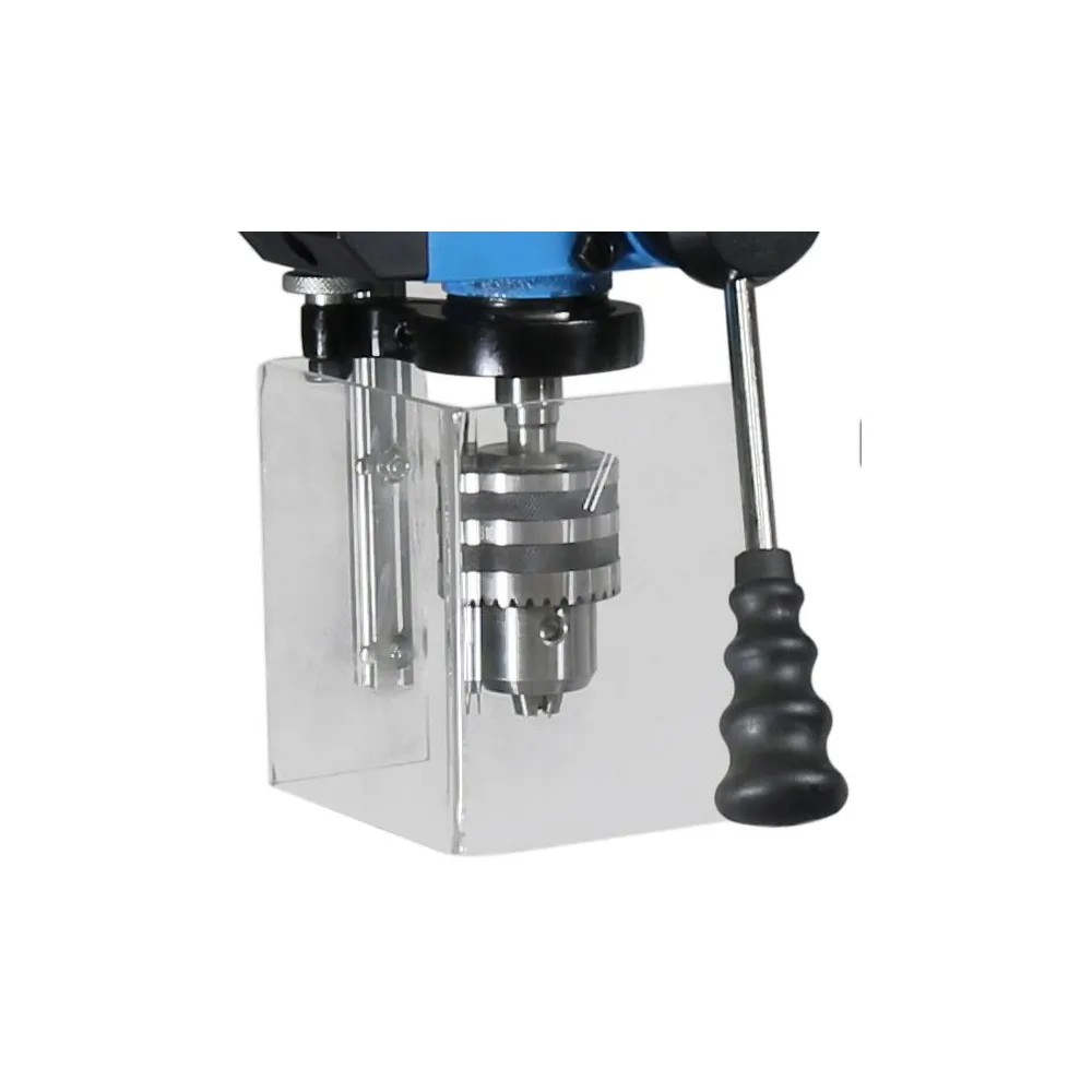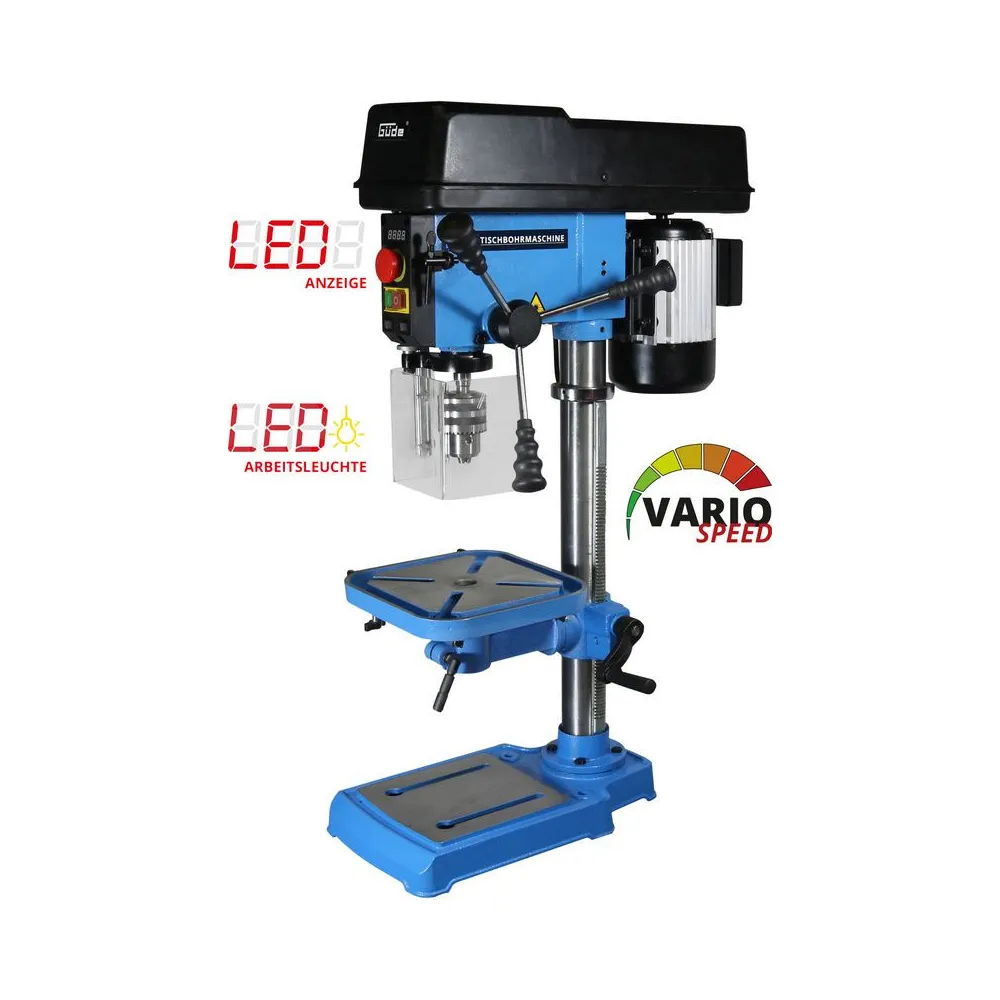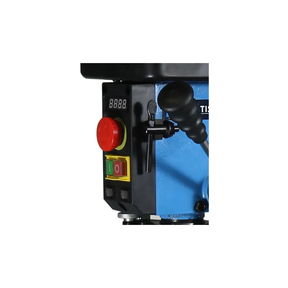 Stolová vŕtačka s pohonom klinovým remeňom s plynulým nastavením rýchlosti. Systém napínania klinových remeňov. Polohovací laser. Digitálne zobrazenie rýchlosti. Vŕtacie vreteno uložené v guličkových ložiskách. Vypínač so spínačom nulového napätia. Núdzový vypínač. LED pracovné svetlo.