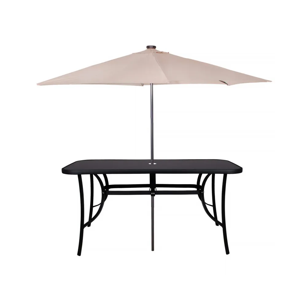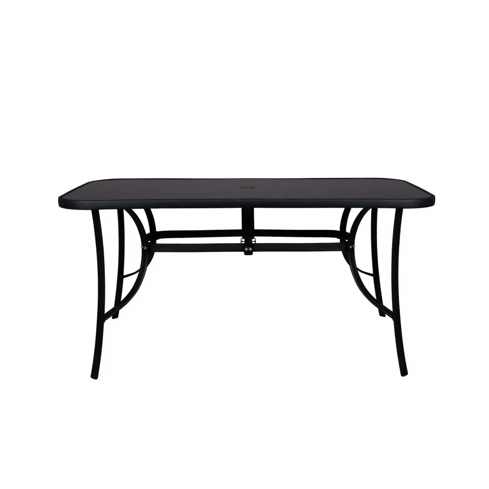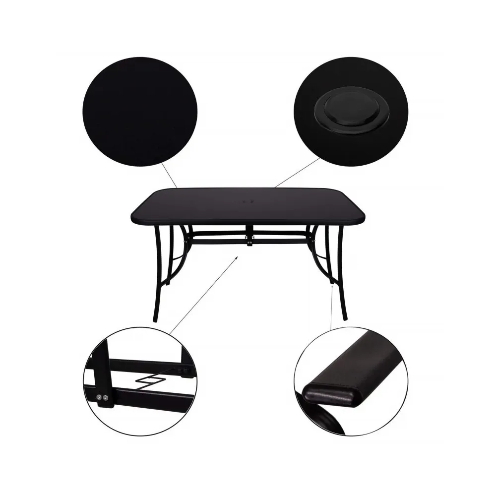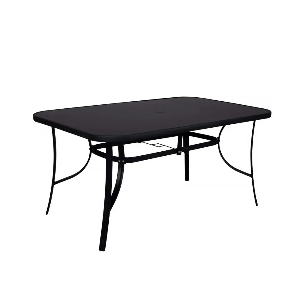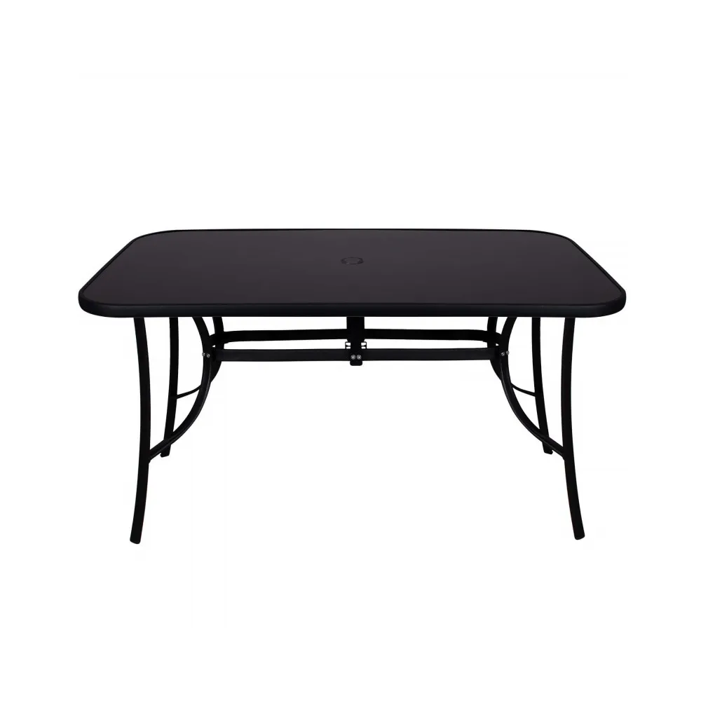Obdĺžnikový záhradný stôl s rozmermi 150x90 cm, vhodný pre 4-6 osôb. Stabilná kovová konštrukcia, 5 mm čierne bezpečnostné sklo, stredový otvor pre slnečník, nosnosť 100 kg.