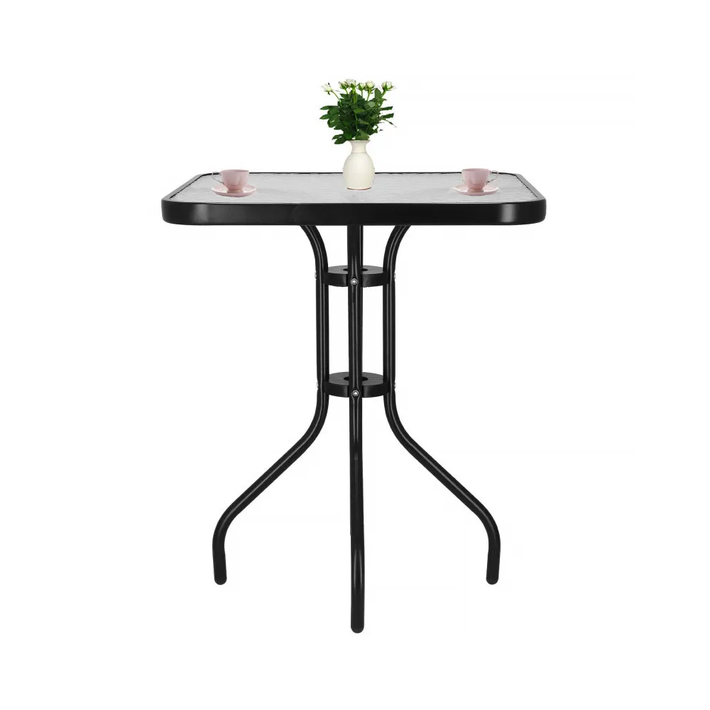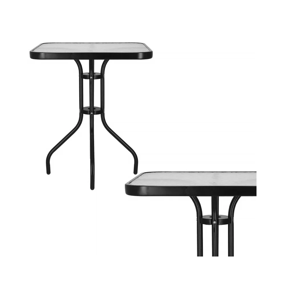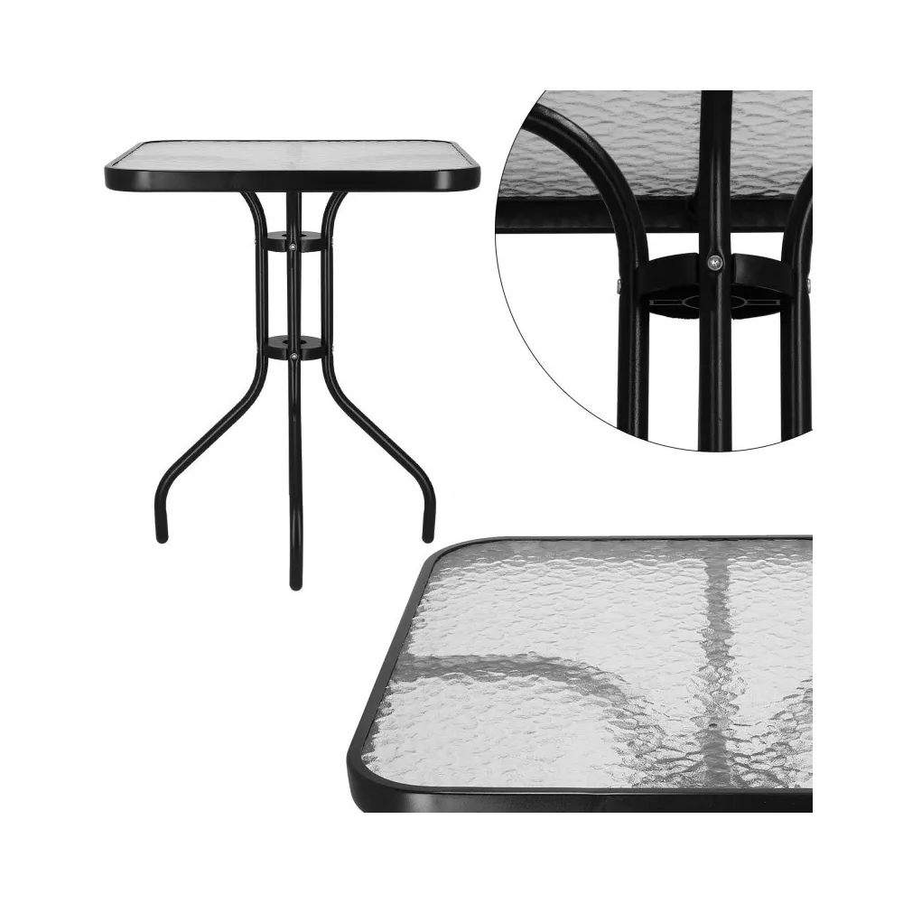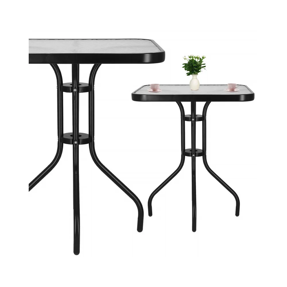Štvorcový záhradný stolík s rozmermi 60x60 cm, vhodný až pre 4 osoby. Stabilná kovová konštrukcia, sklenená doska z tvrdeného skla. Kompaktné rozmery, perfektné na terasy, záhrady alebo ako odkladací stolík.