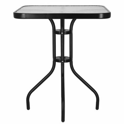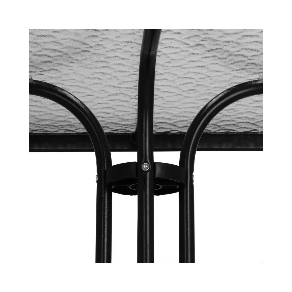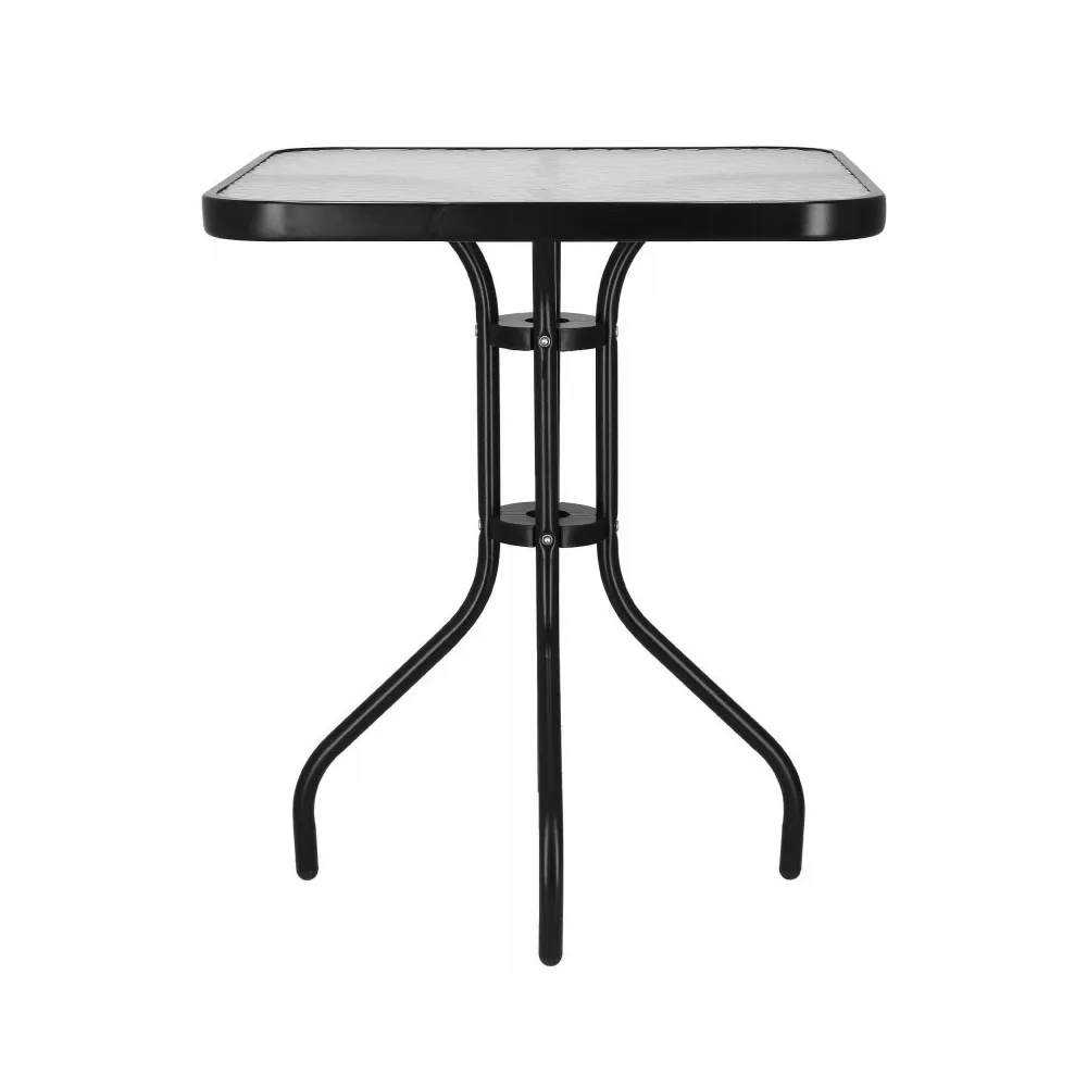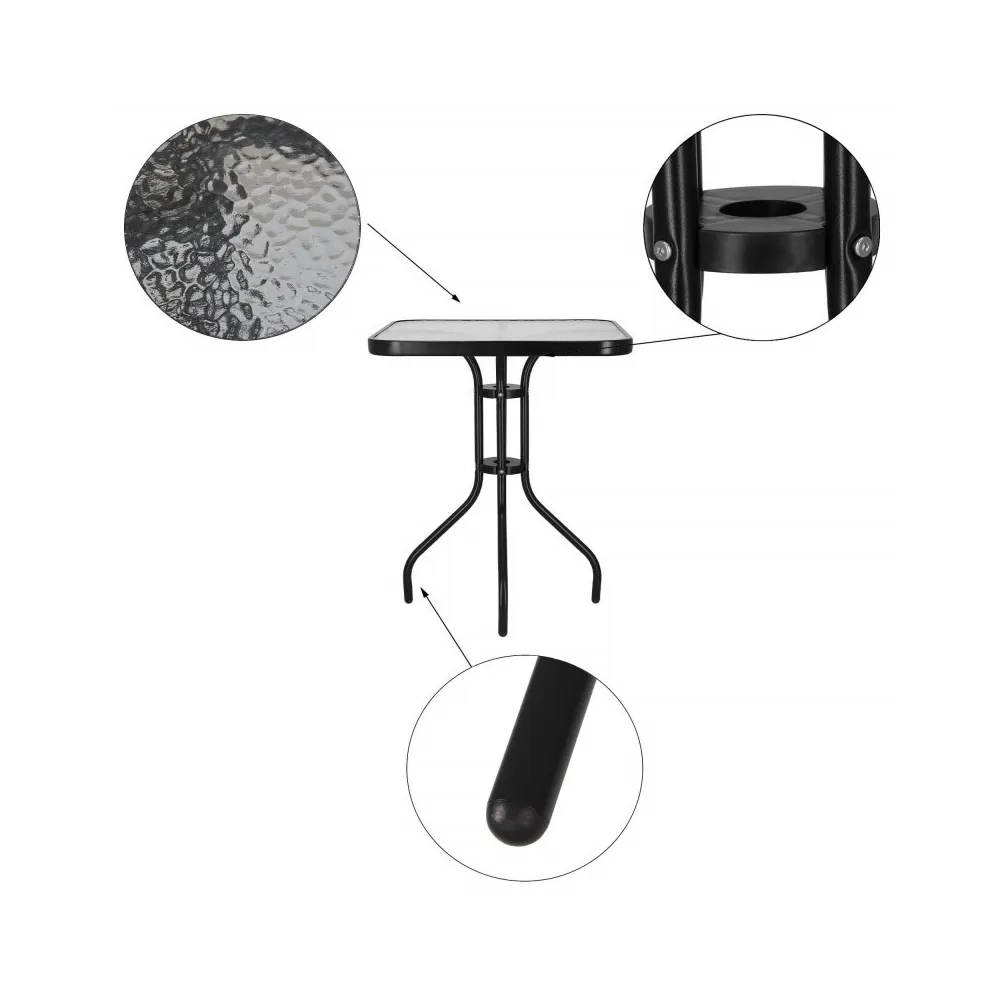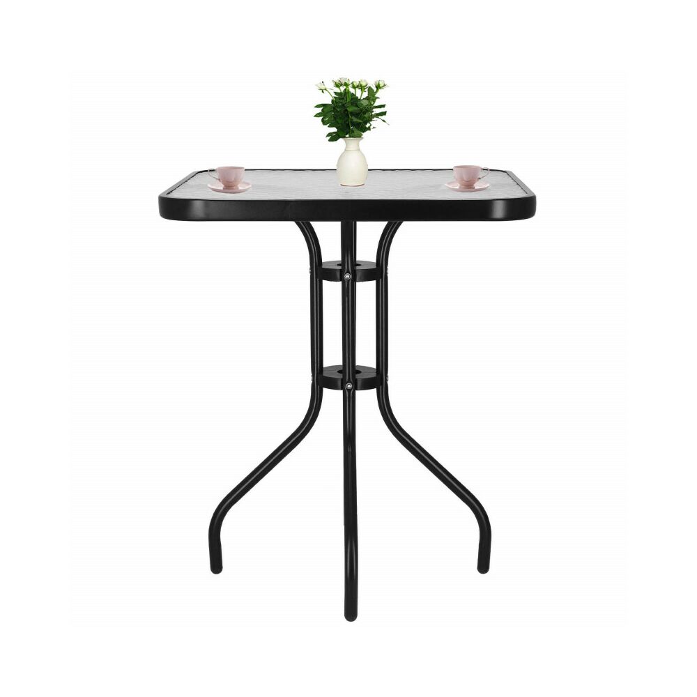 Štvorcový záhradný stolík s rozmermi 60x60 cm, vhodný až pre 4 osoby. Stabilná kovová konštrukcia, sklenená doska z tvrdeného skla. Kompaktné rozmery, perfektné na terasy, záhrady alebo ako odkladací stolík.