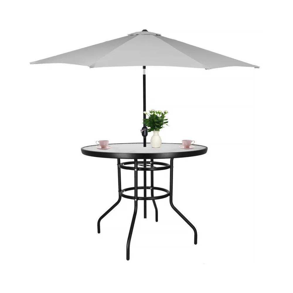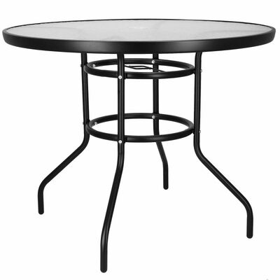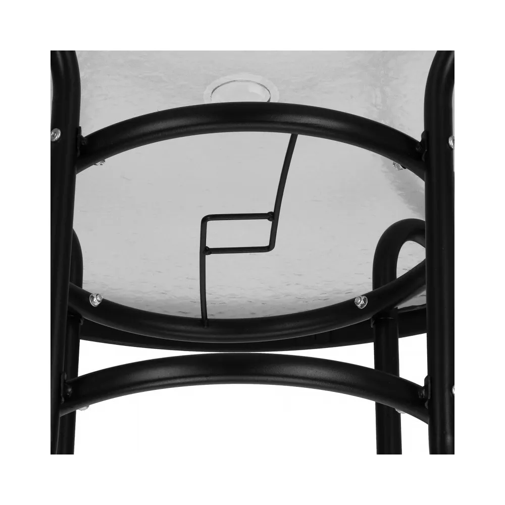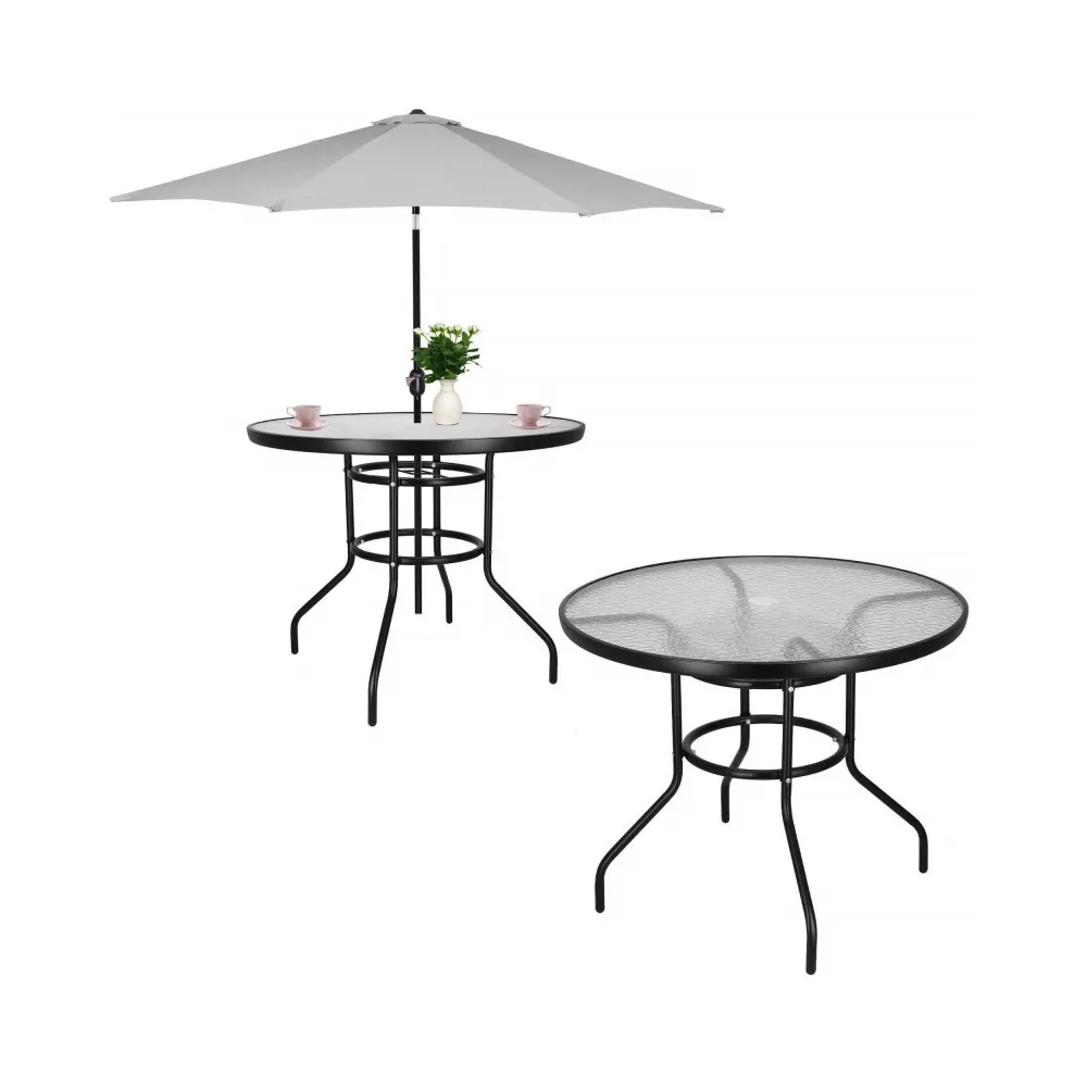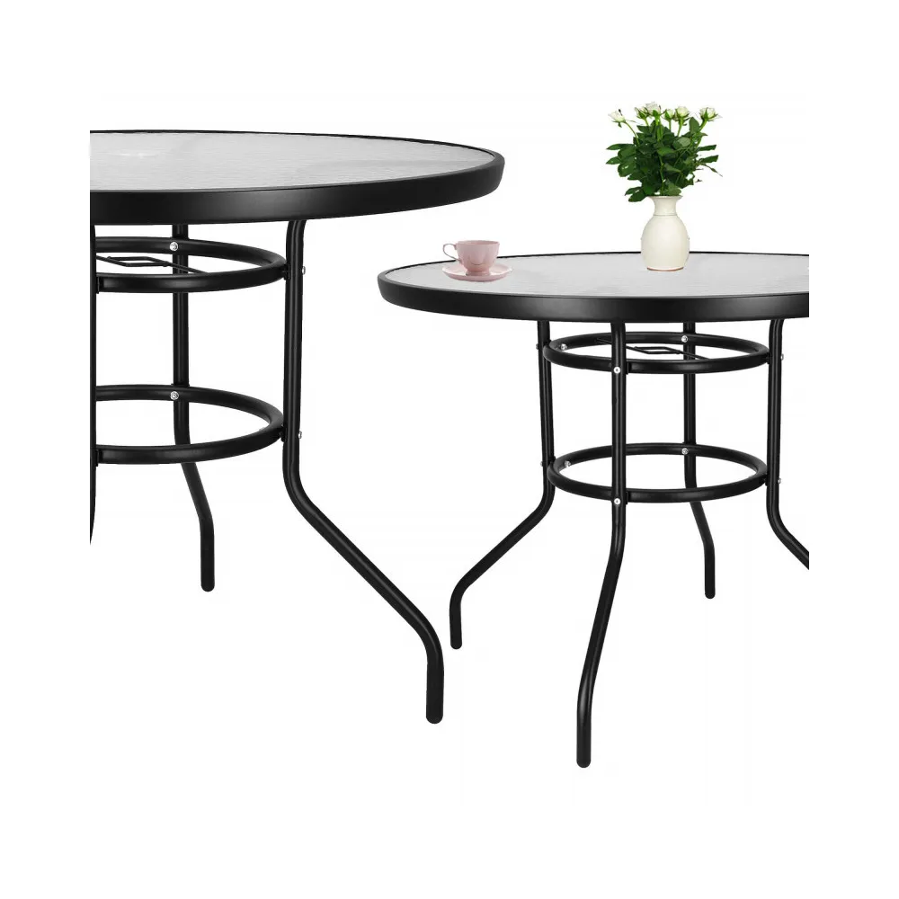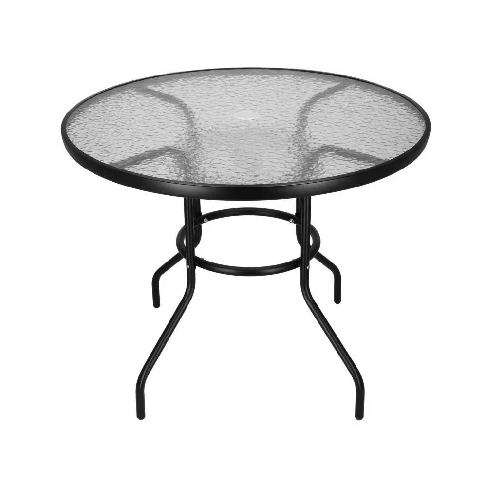 Eleganný záhradný stolík s priemerom 90 cm, vhodný pre 4 osoby. Stabilná kovová konštrukcia, sklenená doska z tvrdeného skla. Kompaktné rozmery, perfektné na terasy, záhrady alebo ako odkladací stolík.