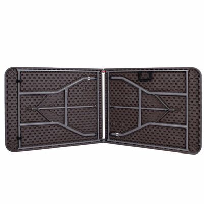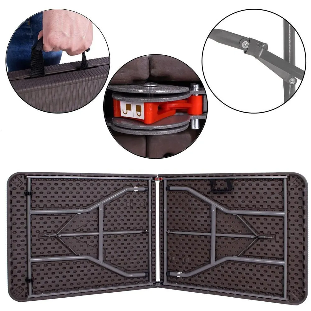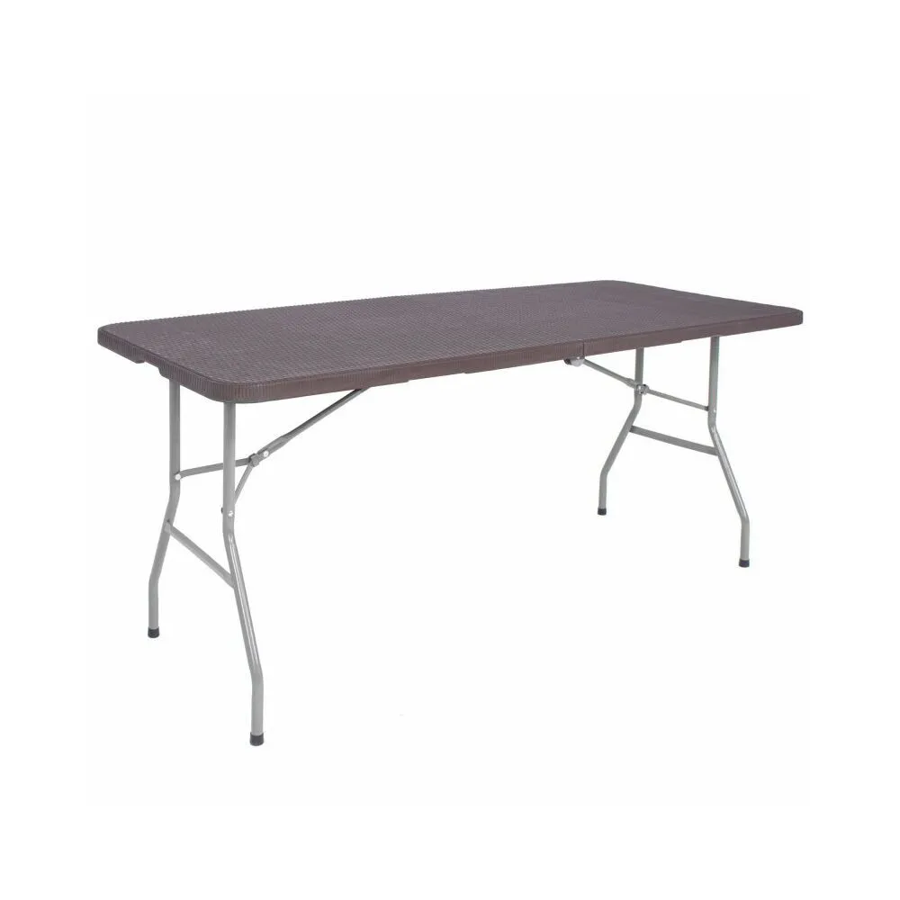 Priestranný skladací stôl ideálny pre rodinné oslavy, bankety a spoločenské akcie. Ponúka priestrannú plochu pre až 8 osôb, ratanový vzhľad dosky stola, nosnosť 150 kg a stabilnú konštrukciu s bezpečnostným zámkom proti zloženiu. 180x74x74 cm (dxšxv).