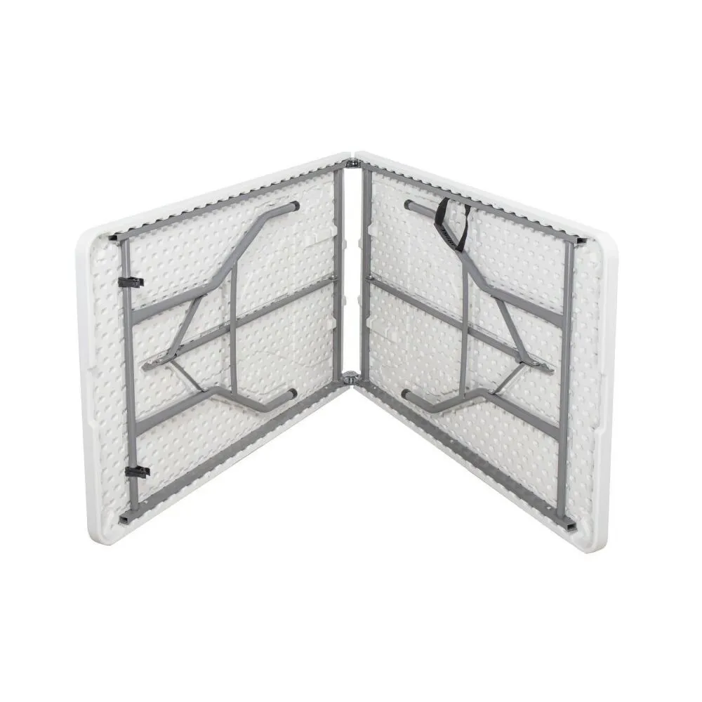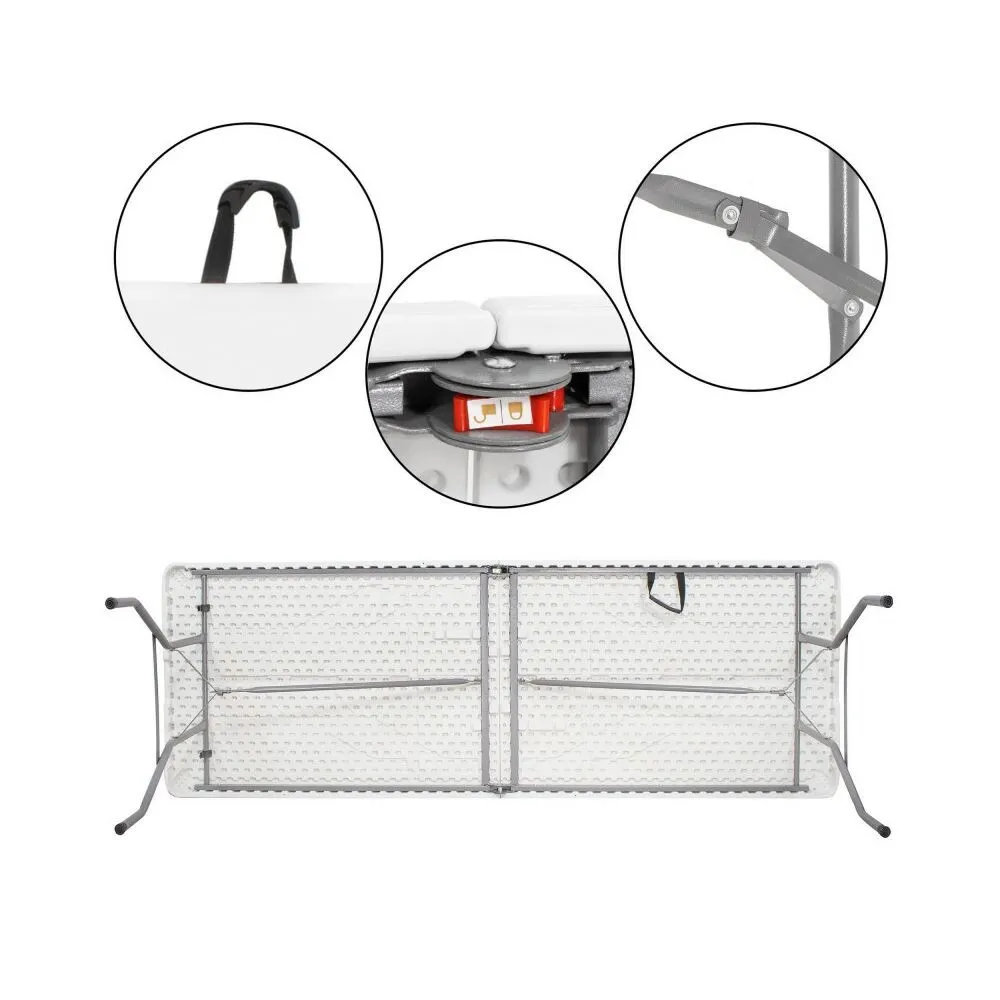 Veľký skladací stôl ideálny na rodinné oslavy, bankety a spoločenské akcie. Ponúka priestrannú plochu pre až 12 osôb, nosnosť 150 kg a stabilnú konštrukciu s bezpečnostným zámkom proti zloženiu. Je odolný voči poveternostným vplyvom, ľahko sa udržuje a je možné ho zložiť do kompaktného kufra s rukoväťou pre pohodlné prenášanie. Rozmery 240x75x75 cm (dxšxv).