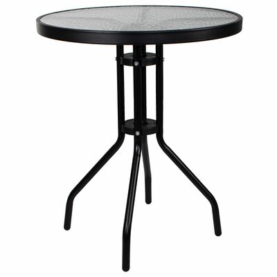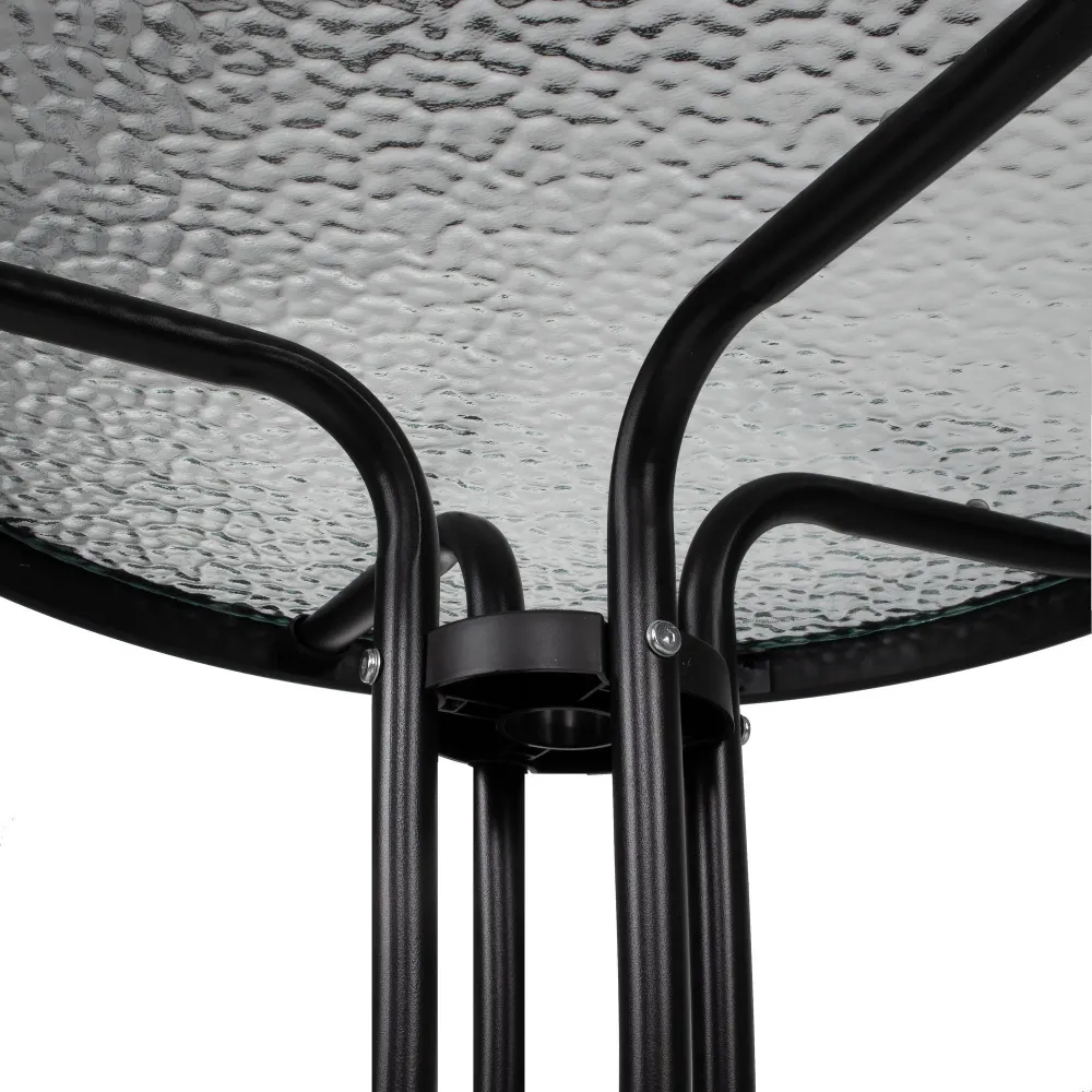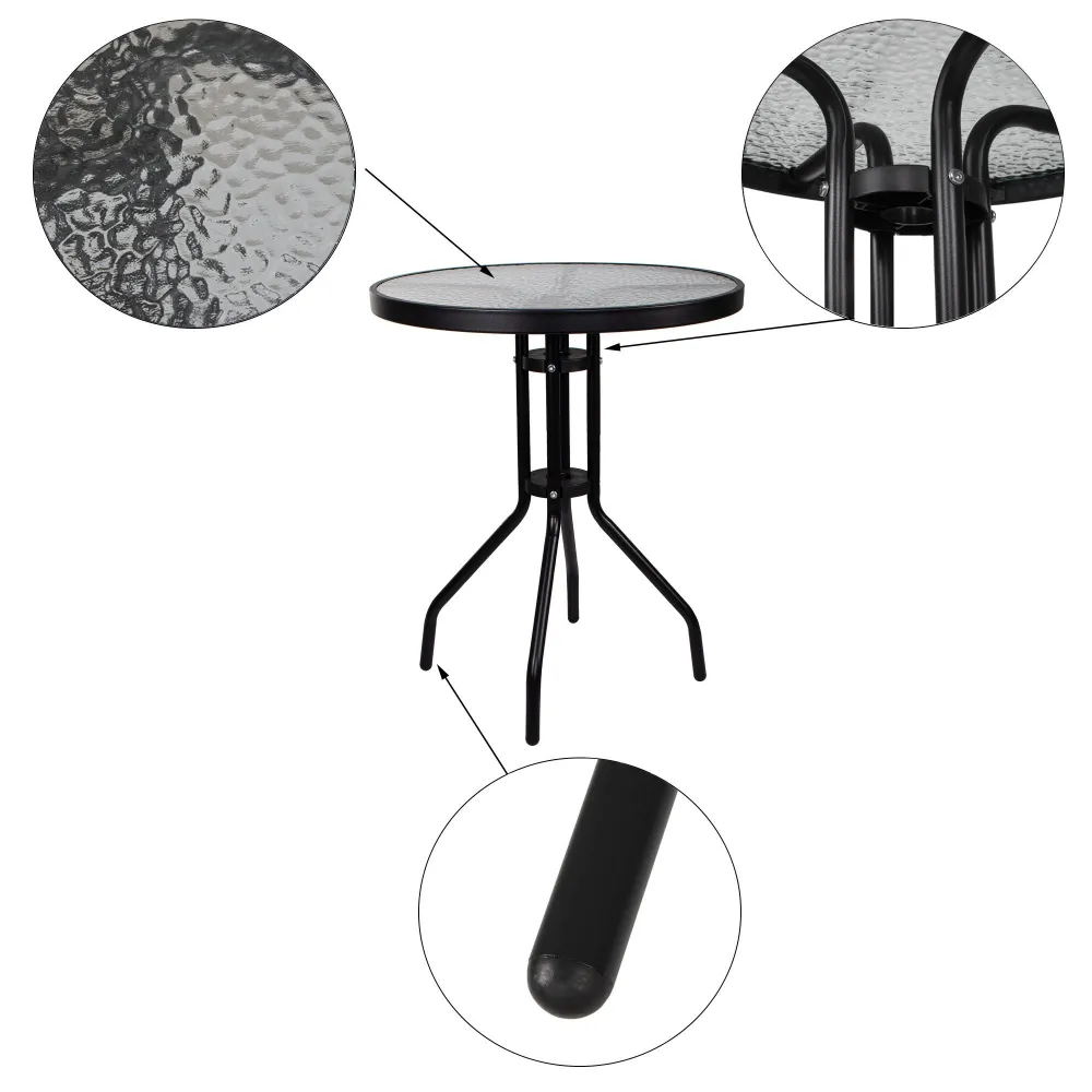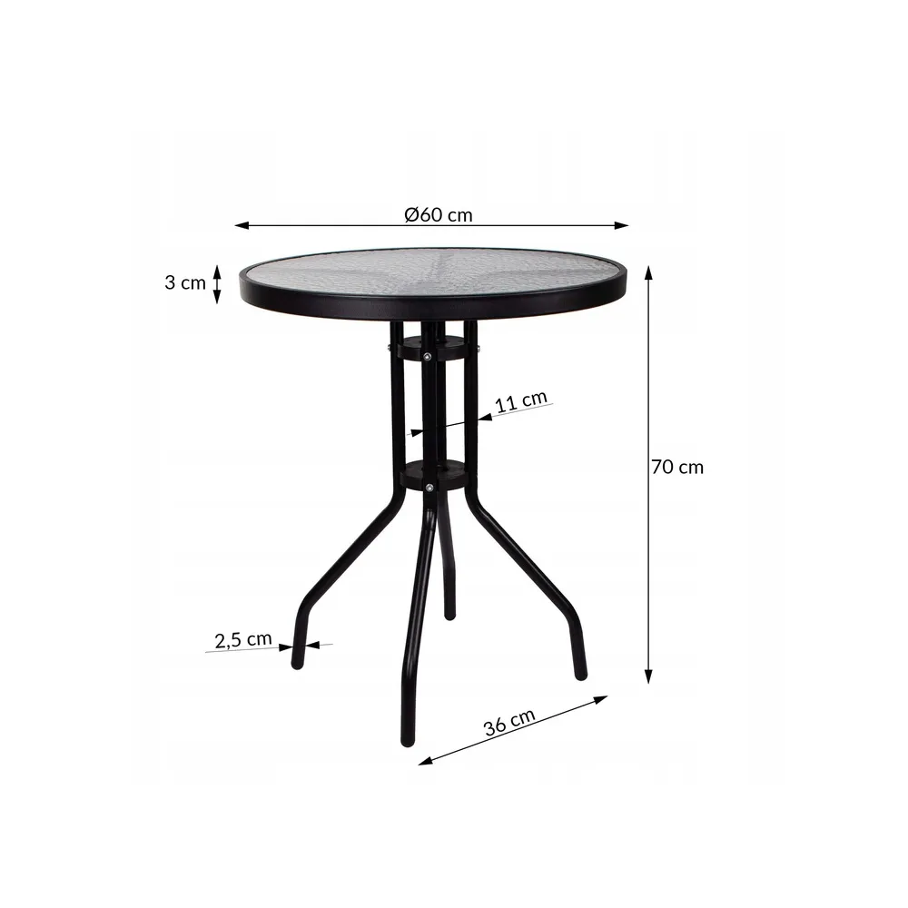Eleganný záhradný stolík s priemerom 60 cm, vhodný pre 2 osoby. Stabilná kovová konštrukcia, sklenená doska z tvrdeného skla. Kompaktné rozmery, perfektné do malých priestorov, na balkóny alebo ako odkladací stolík.