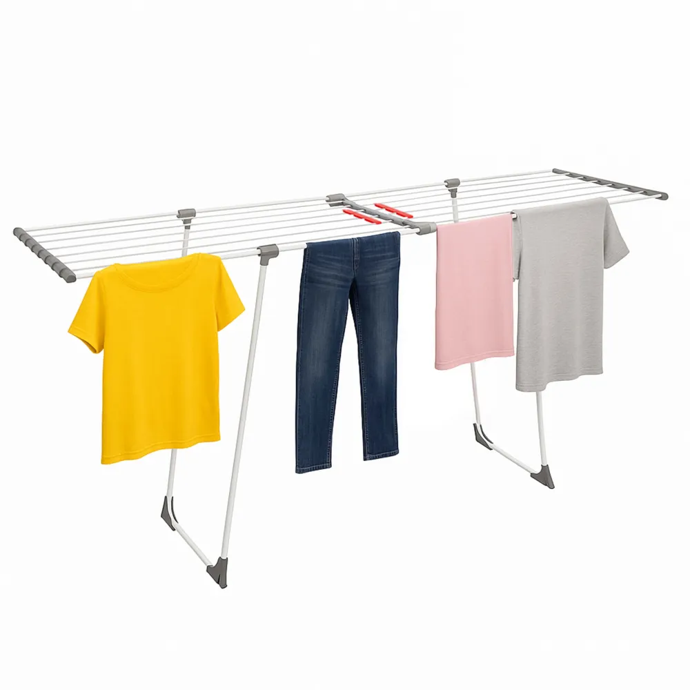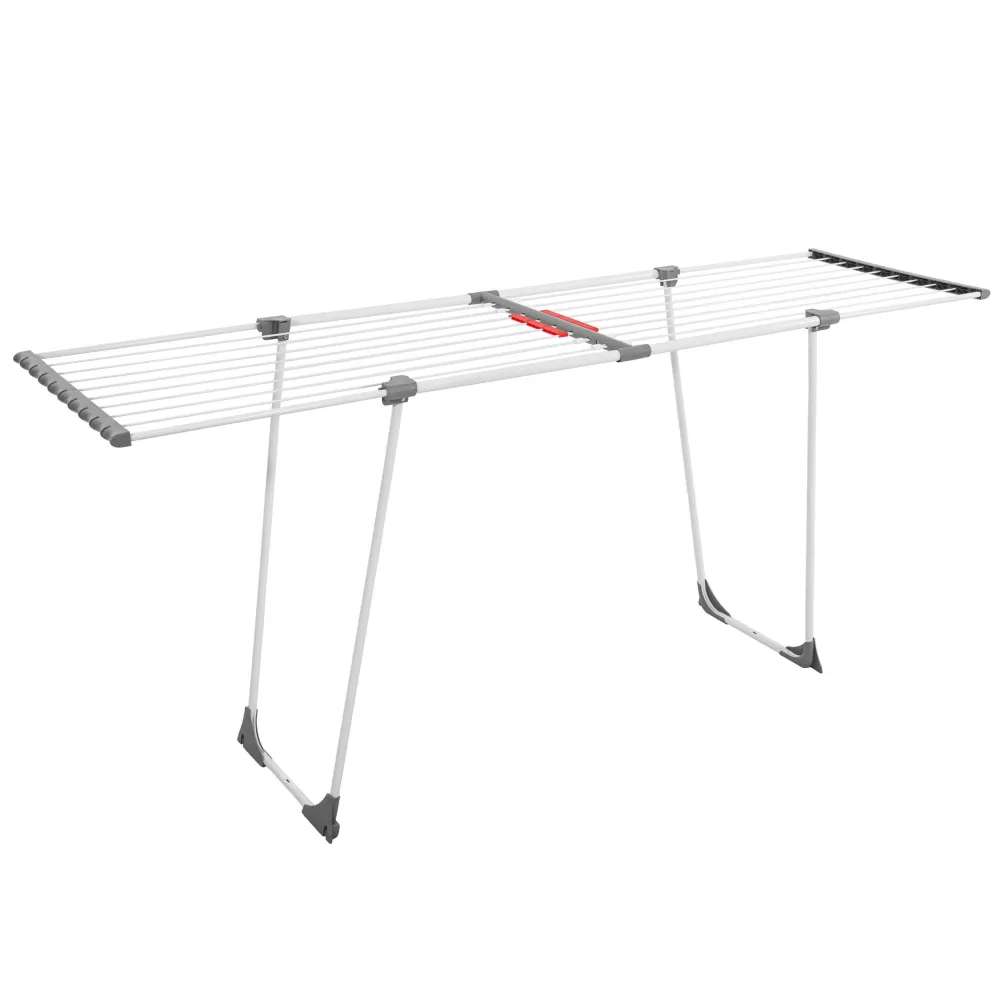 Viacúčelový skladací sušiak s výsuvnými ramenami ponúka až 19 metrov priestoru na sušenie bielizne. Vďaka nastaviteľnej dĺžke sa prispôsobí aktuálnym potrebám. Má odolnú kovovú konštrukciu, zámok proti nechcenému rozloženiu a kolieska pre ľahké premiestnenie. Úchyty na drobnú bielizeň a protišmykové konce nôh zaisťujú pohodlné a bezpečné používanie. Skladacia konštrukcia šetrí miesto. Rozmery v rozloženom stave 109-197x55x90 cmcm, zložený 54x9x109 cm cm. Nosnosť 15 kg.
