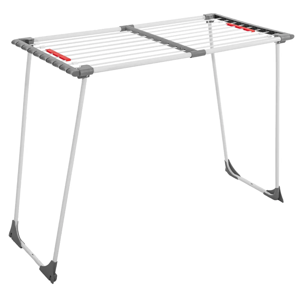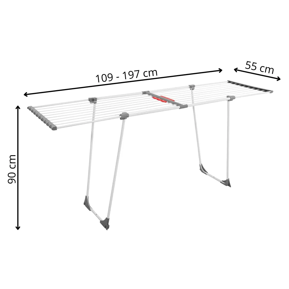 Viacúčelový skladací sušiak s výsuvnými ramenami ponúka až 19 metrov priestoru na sušenie bielizne . Vďaka nastaviteľnej dĺžke sa prispôsobí aktuálnym potrebám. Má odolnú kovovú konštrukciu, zámok proti nechcenému rozloženiu a kolieska pre ľahké premiestnenie. Úchyty na drobnú bielizeň a protišmykové konce nôh zaisťujú pohodlné a bezpečné používanie. Skladacia konštrukcia šetrí miesto. Rozmery v rozloženom stave 109-197x55x90 cmcm, zložený 54x9x109 cm cm. Nosnosť 15 kg.