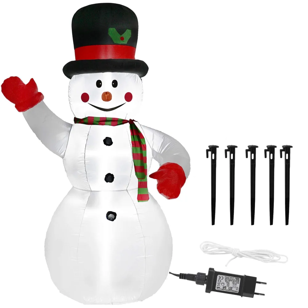 Ohromujúci nafukovací snehuliak s LED diódami. Úžasná 3D svetelná dekorácia vhodná na vnútorné i vonkajšie použitie. Adaptér na bezpečné napätie, vodeodolné prevedenie, krytie IP44. Ultra úsporná prevádzka, farba diód studená biela. Výška 240 cm, napájací kábel 2 m.
