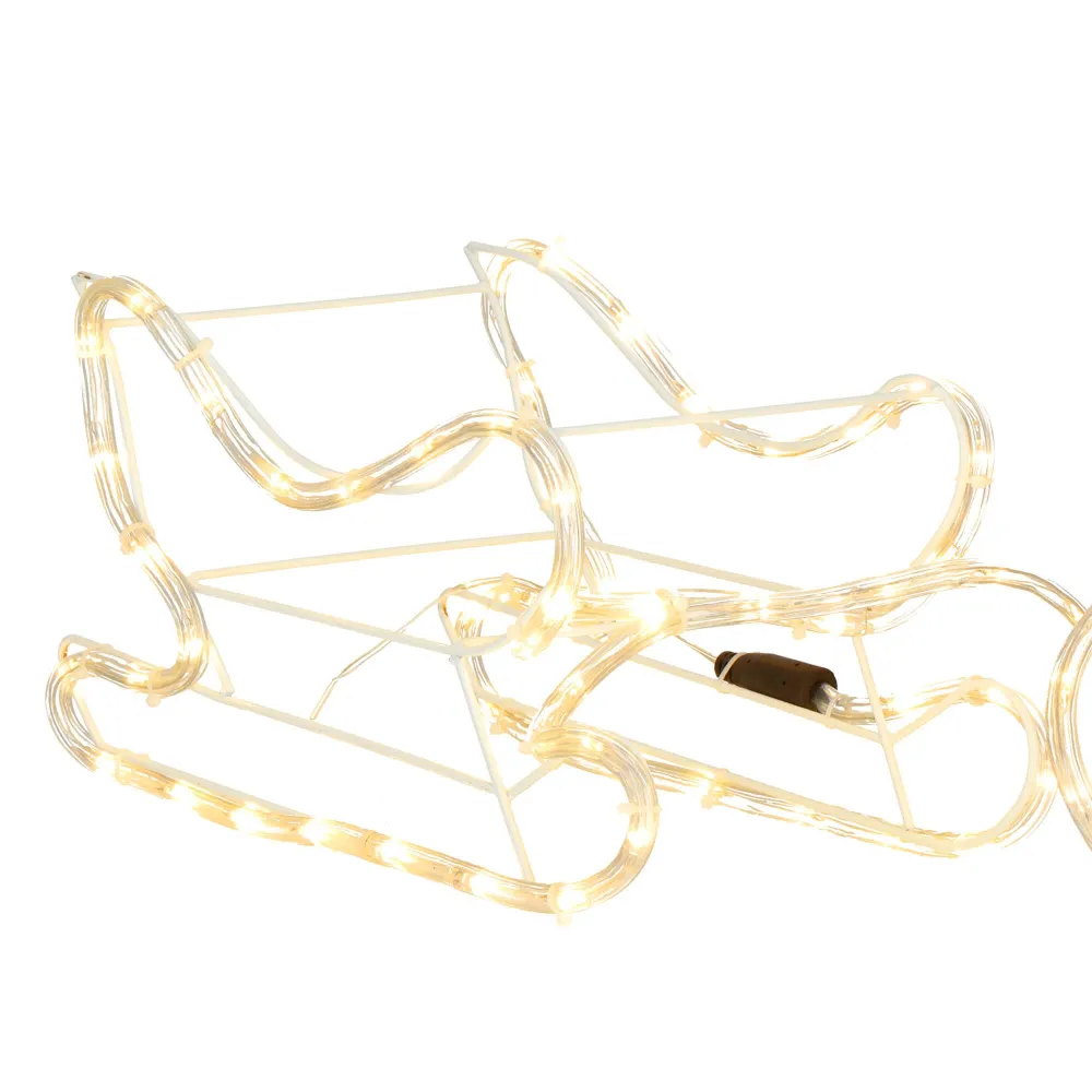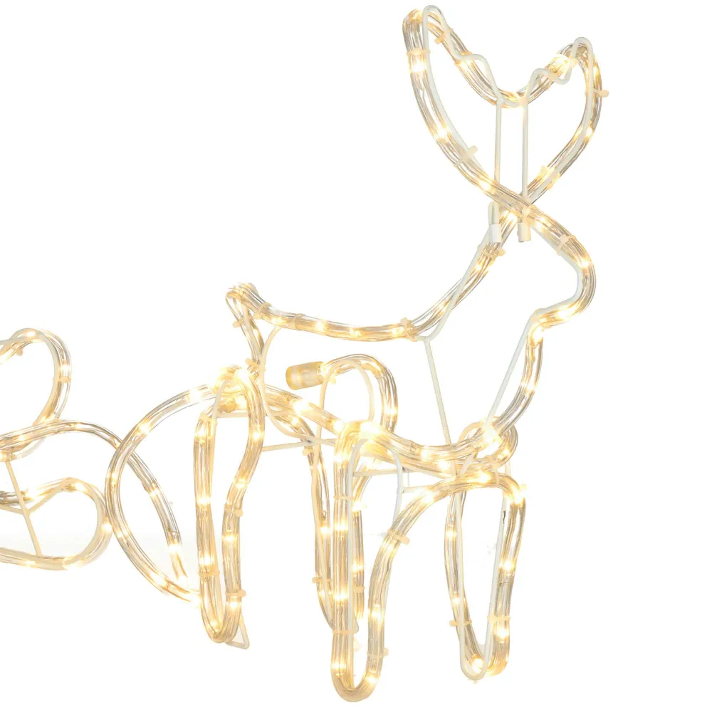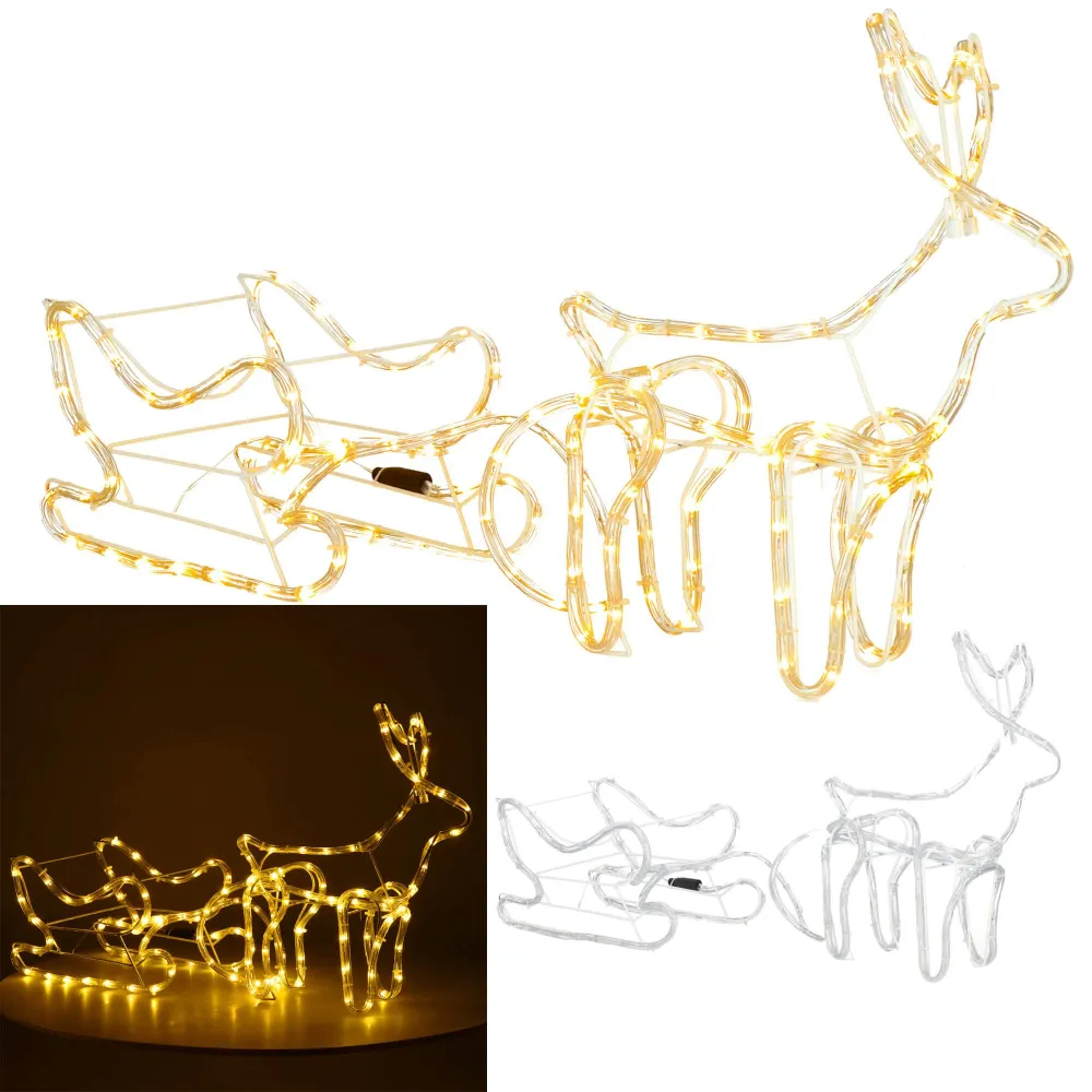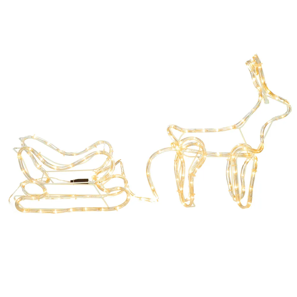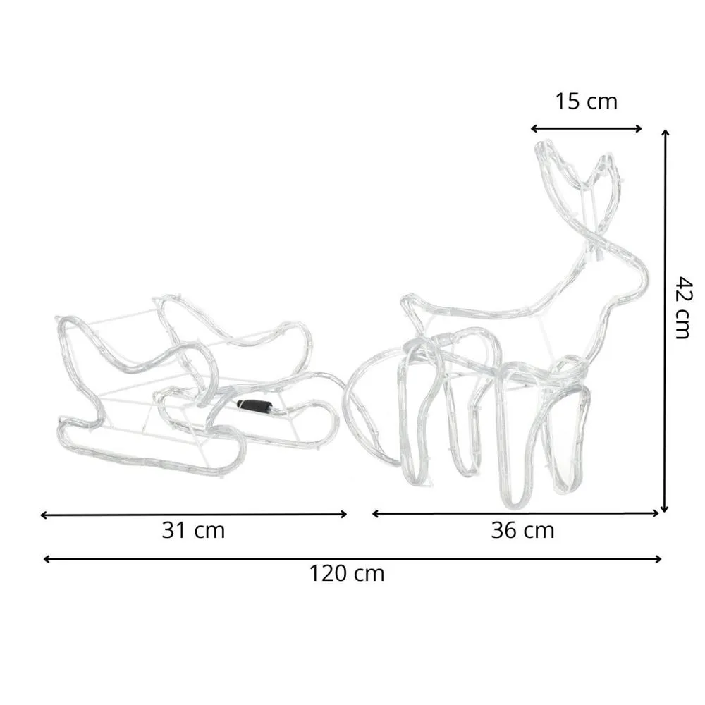 Prekrásny sob so saňami, vztýčenou hlavou a mohutným parožím. Úžasná 3D svetelná dekorácia vhodná pre vnútorné aj vonkajšie použitie, vodeodolné prevedenie, krytie IP44. Úsporné diódy, farba teplá biela. Dĺžka 120 cm, 144 LED, napájací kábel 3 m.