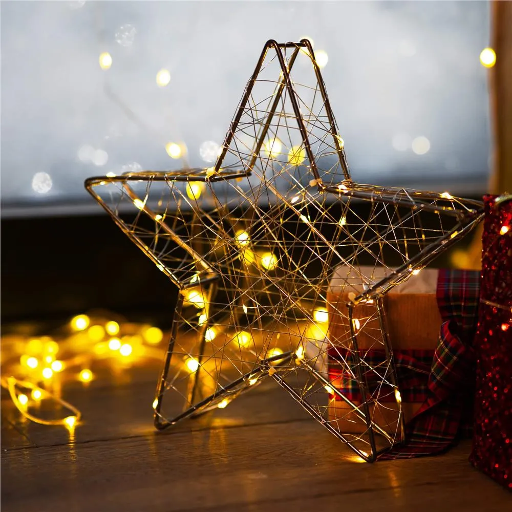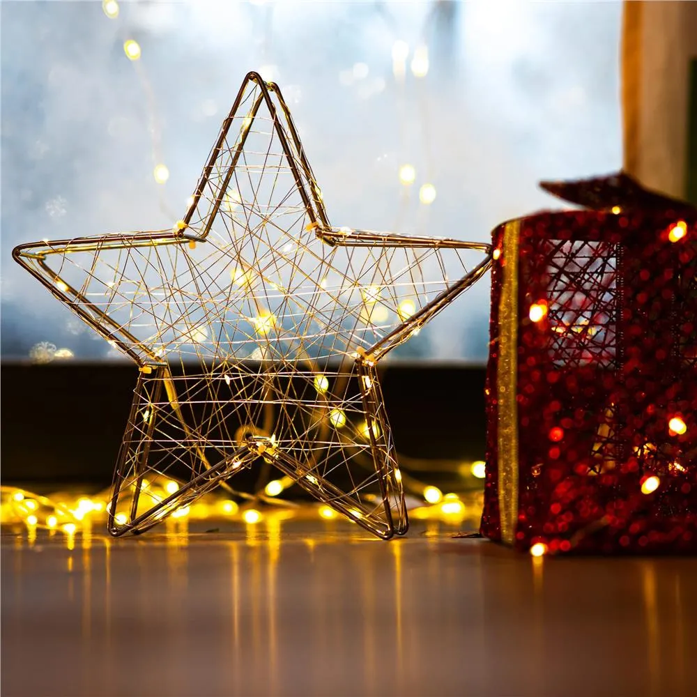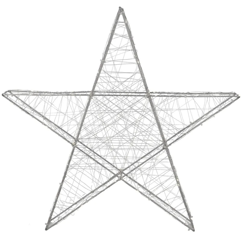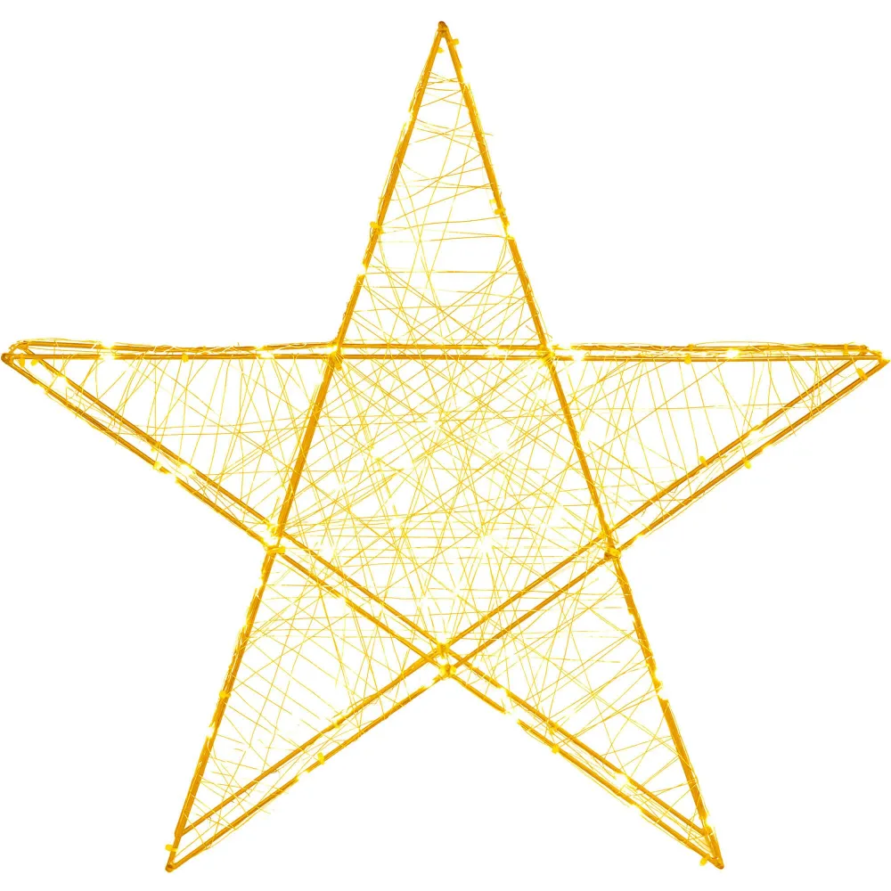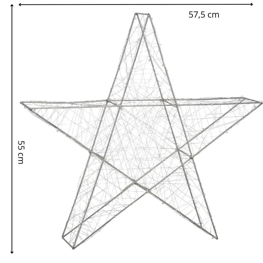 Elegantná svietiaca vianočná hviezda. Úžasná 3D svetelná dekorácia vhodná na vnútorné použitie, úsporné nano diódy, krytie IP20. Napájanie 3xAA, farba teplá biela. Výška 55 cm, 100 LED, napájací kábel 27 cm.