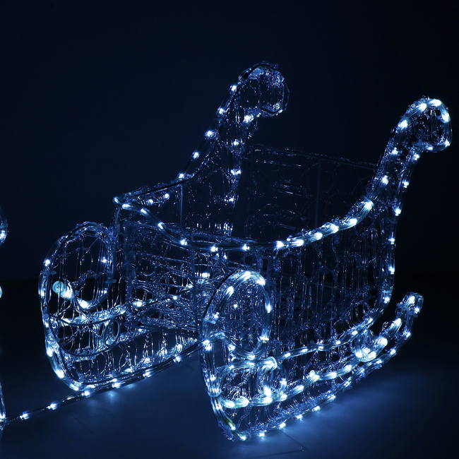 Majestátny sob so saňami, vysokým parožím a konštrukciou zdobenou výpletom. Úžasná 3D svetelná dekorácia vhodná pre vnútorné aj vonkajšie použitie, vodeodolné prevedenie, krytie IP44. Úsporné diódy, farba studená biela. Dĺžka 150 cm, 312 LED, napájací kábel 2 m.